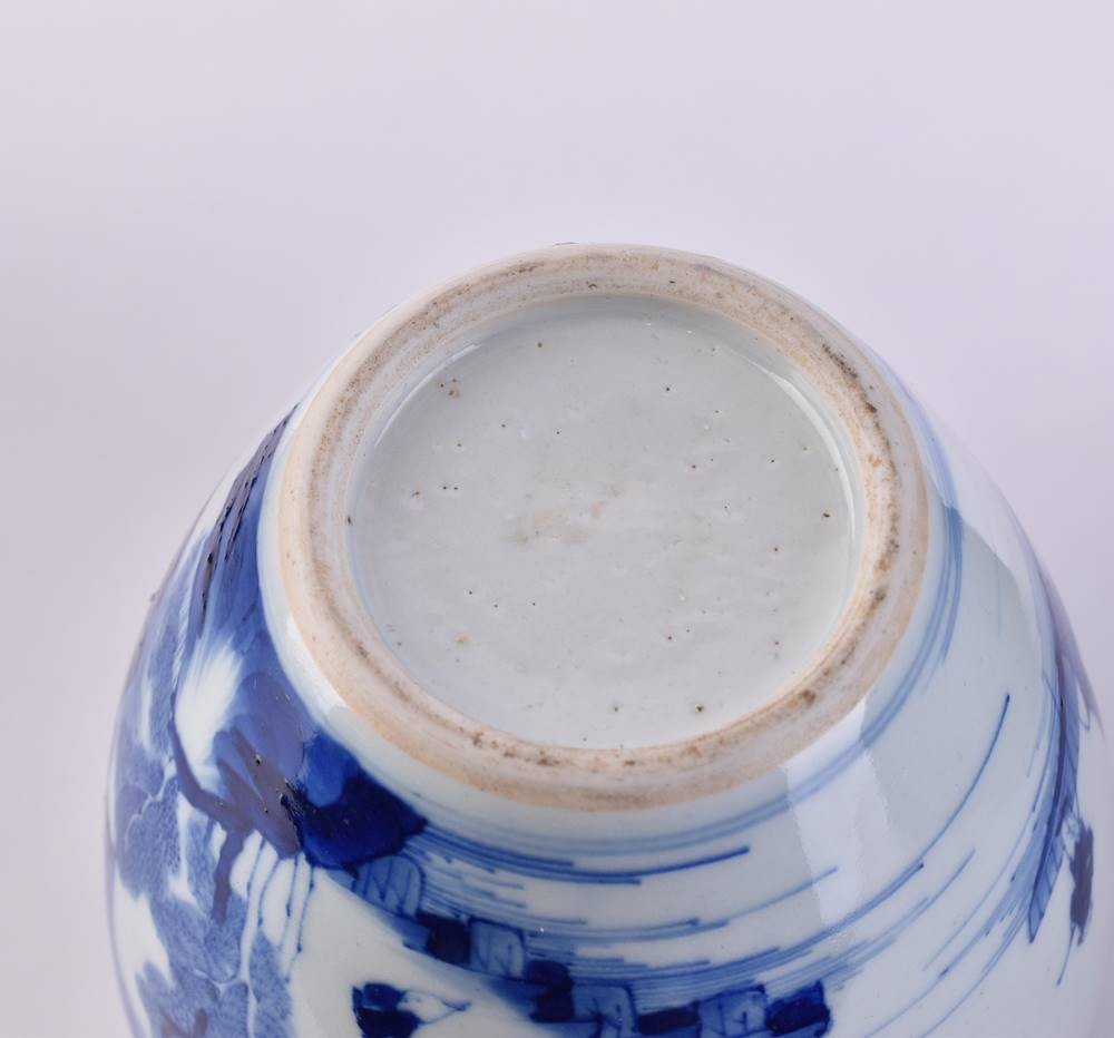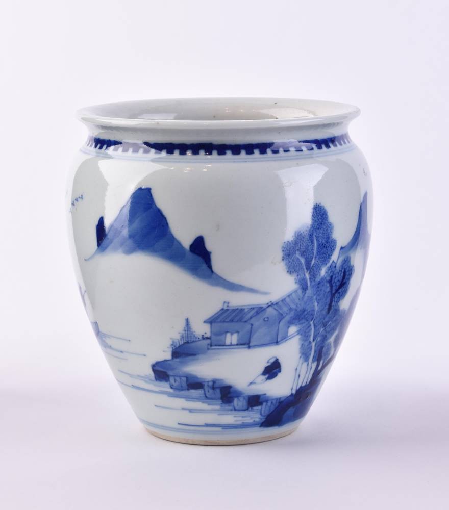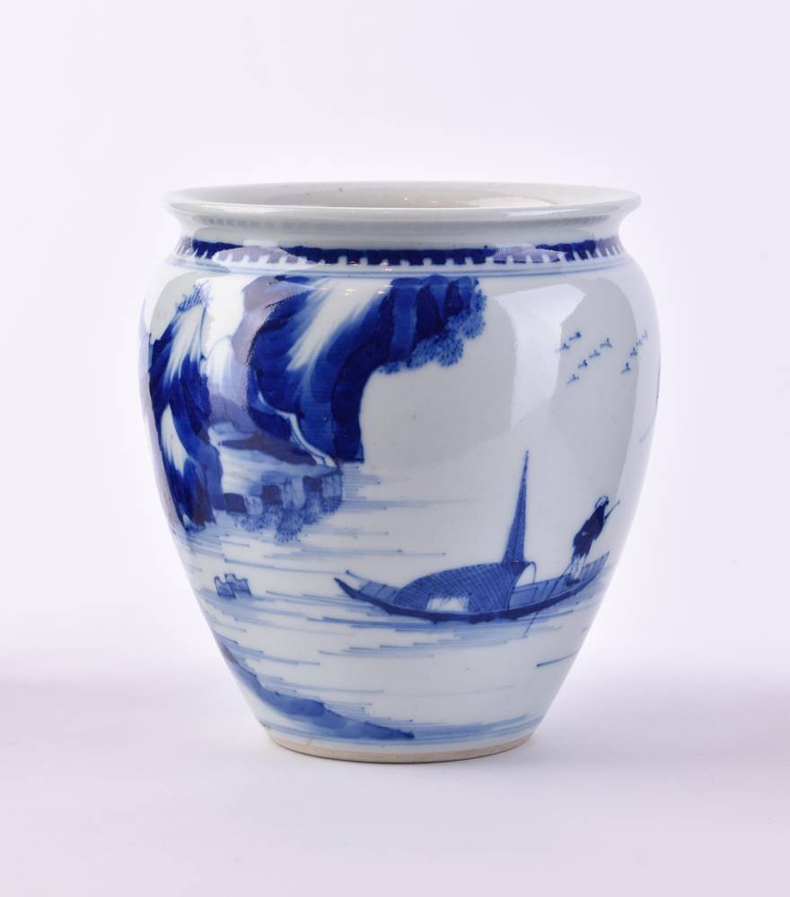 Porzellan, farbig staffiert in blau- weiß, umlaufend Landschaftsdekor- Berglandschaft und See, glasiert, H. 14 cm Ø 12,5