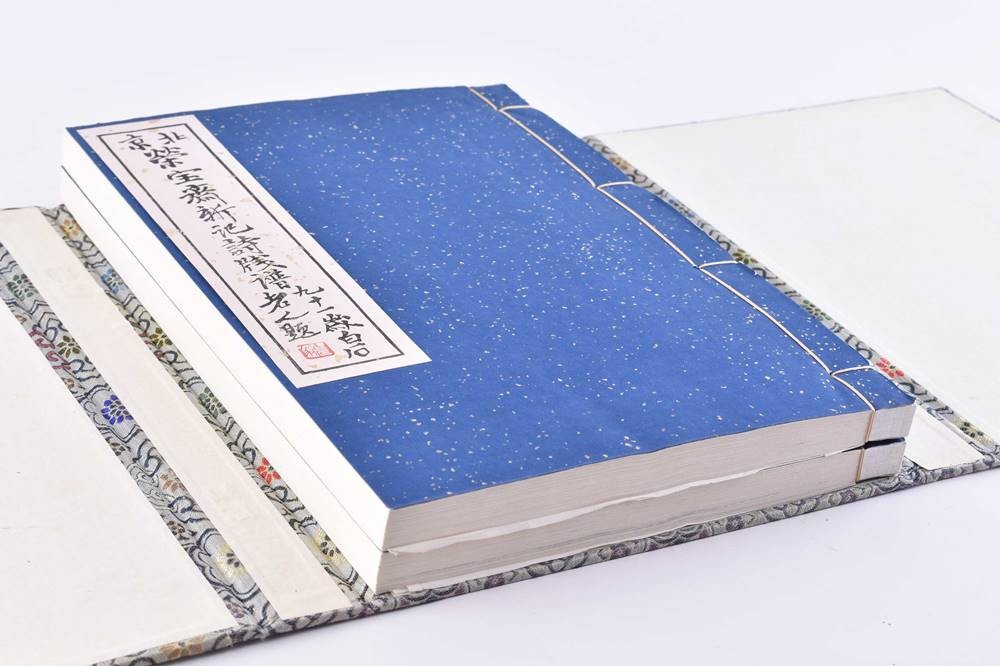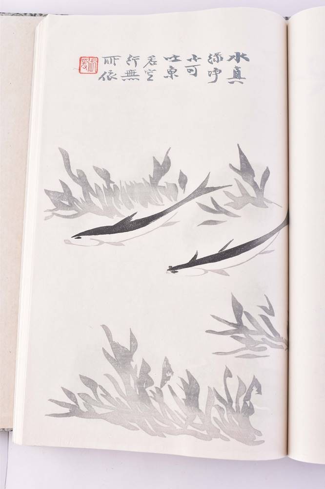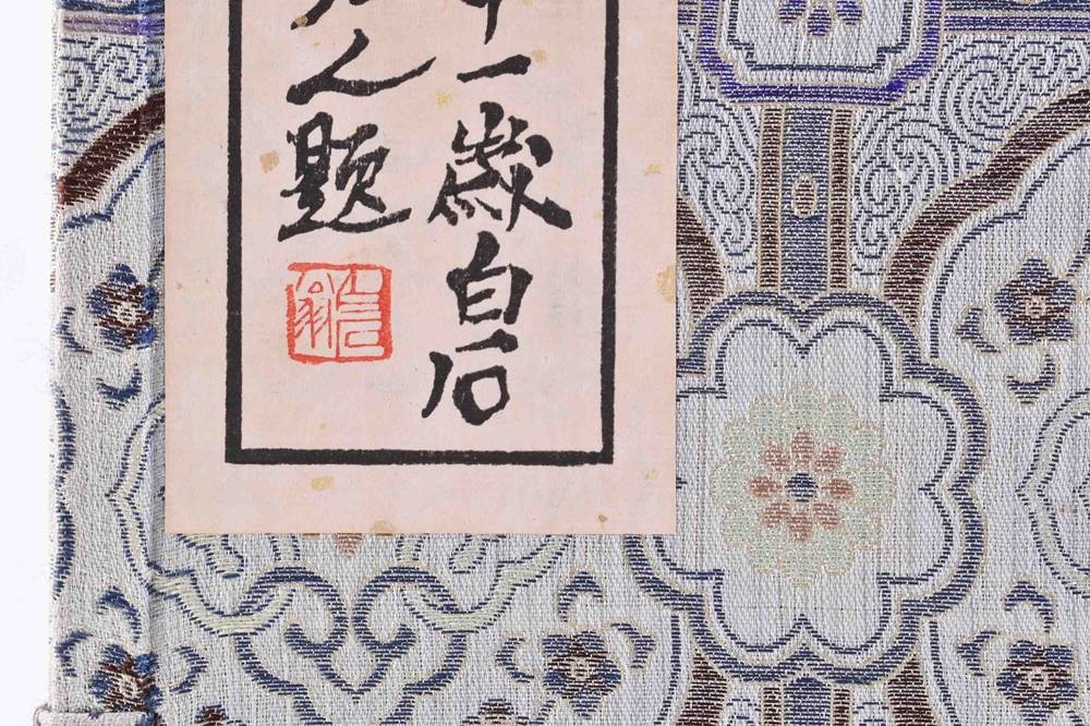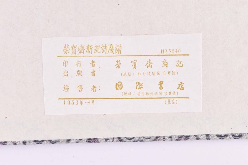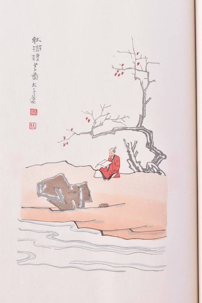 Druckfrisches Exemplar mit 120 Farbholzschnitten, nachtblaue, mit Blattgold gesprenkelte Original Umschläge, als Blockbücher mit Seidenkordel gebunden und mit montierten Titelschildern. In Portfolio mit 3 Deckeln und Brokat Seiden Bezug mit montiertem Titelschild und 2 beinernen Steckschließen, Verlag: Peking, Rong Bao Ziai Xing ji Oktober 1953, Maße: 31,4 cm x 31,5 cm