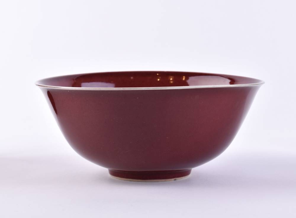 Porzellan, ochsenblutfarbene Fond, glasiert, unterm Stand Unterglasur blaue 6 Zeichen Daqing Qianlong Nianzhi Bodenmarke, H: 7,3 cm Ø 17,5