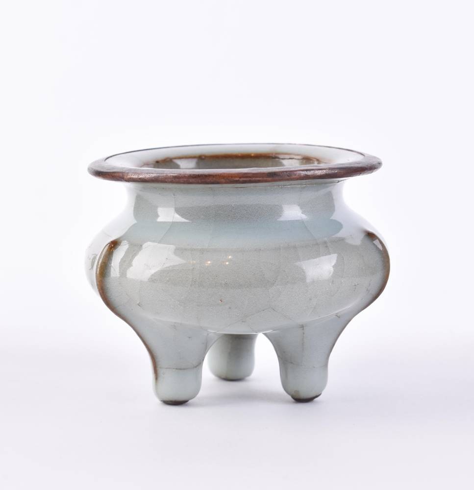 Porzellan, glasiert, krakeliert, auf drei Füßen stehend, Lippenrand mit Stahlring verstärkt, H. 6,5 cm Ø 8