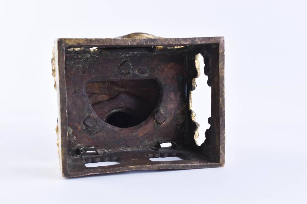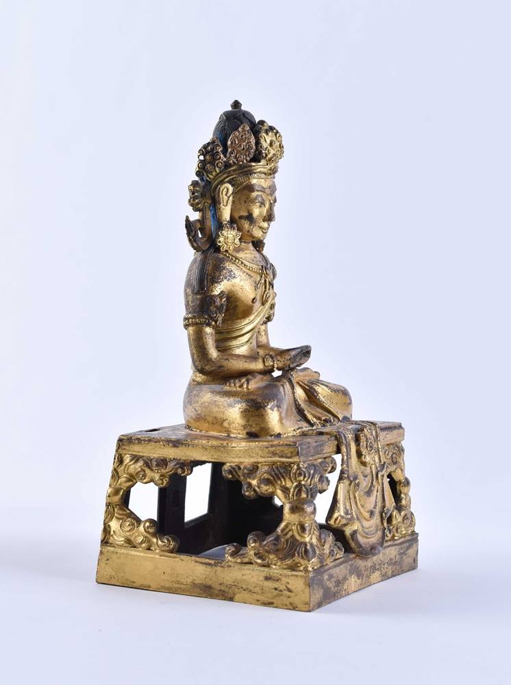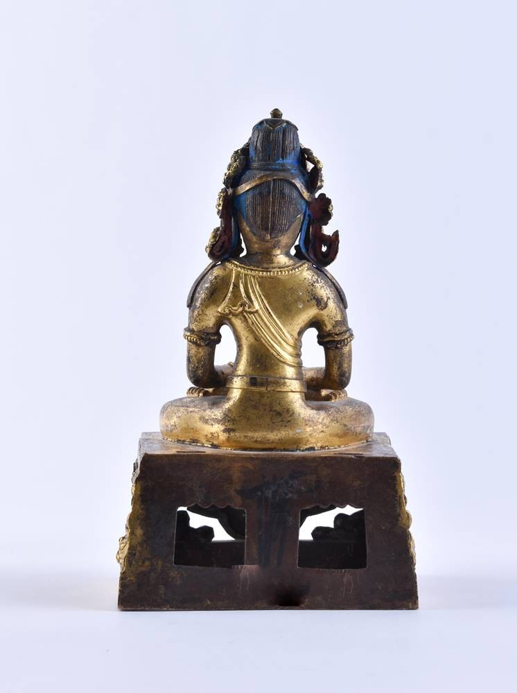 Feuervergoldete Bronze. Im Meditationssitz auf einem hohen, viereckigen Thron, dessen Vorderseite ein mit Blüte verzierter Stoffbehang schmückt. Die Hände in dhyana mudra hielten ursprünglich die Vase mit Lebenselixier, dabei Kopie der Rechnung von 1975 Ostasiatische Antiquitäten Berlin, Kaitstraße , H. 18,6 cm