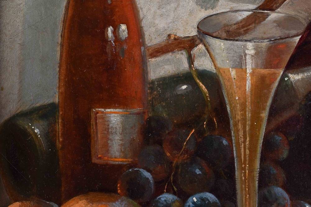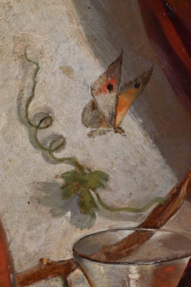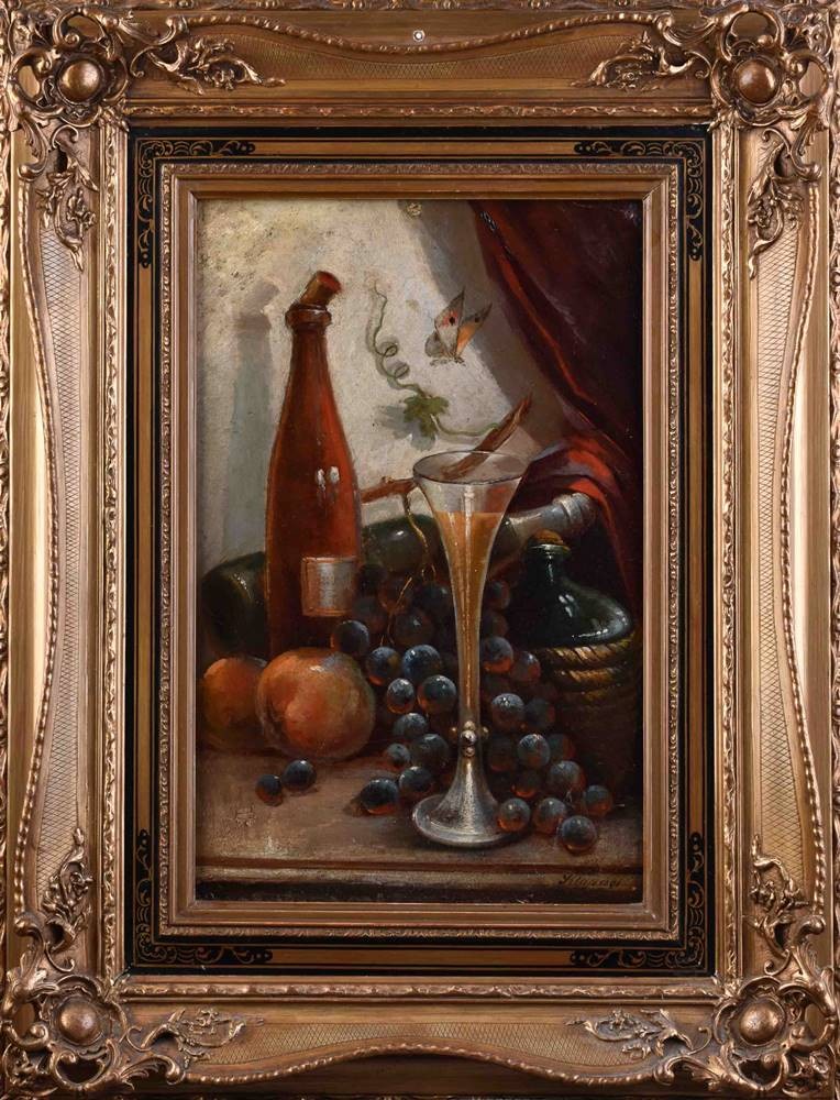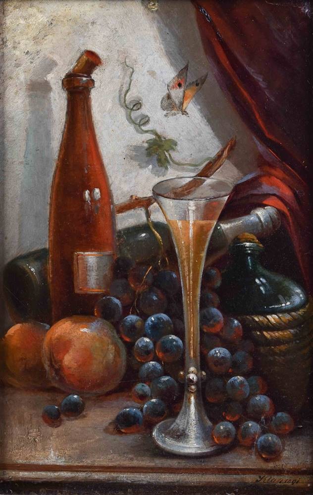 "Früchtestillleben mit Weinflasche, Glas und Schmetterling"