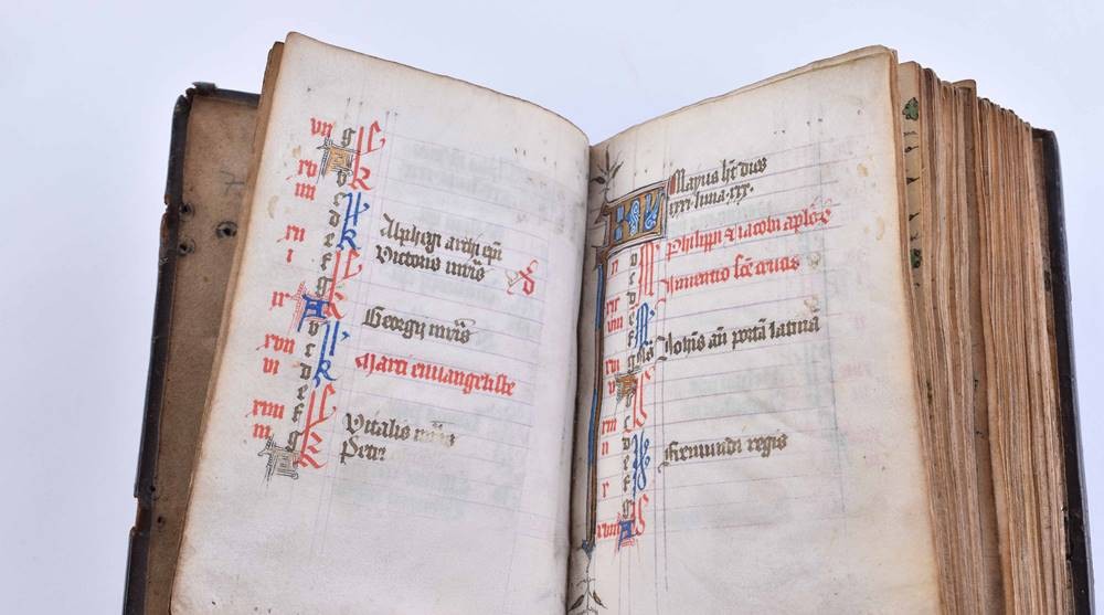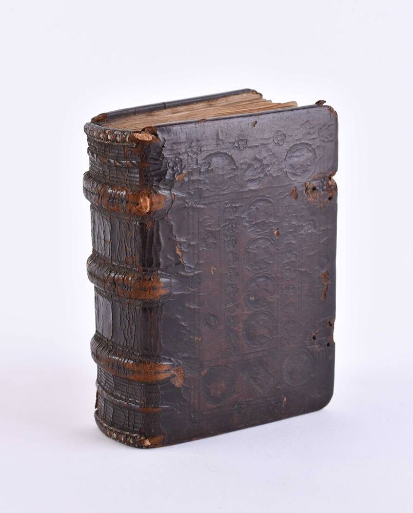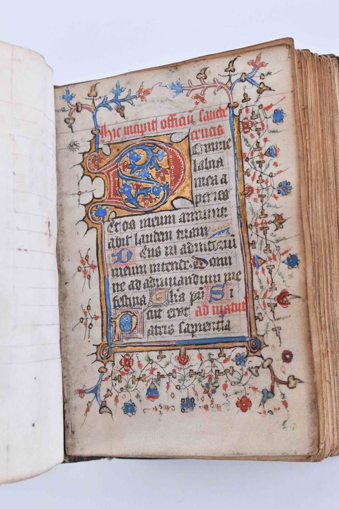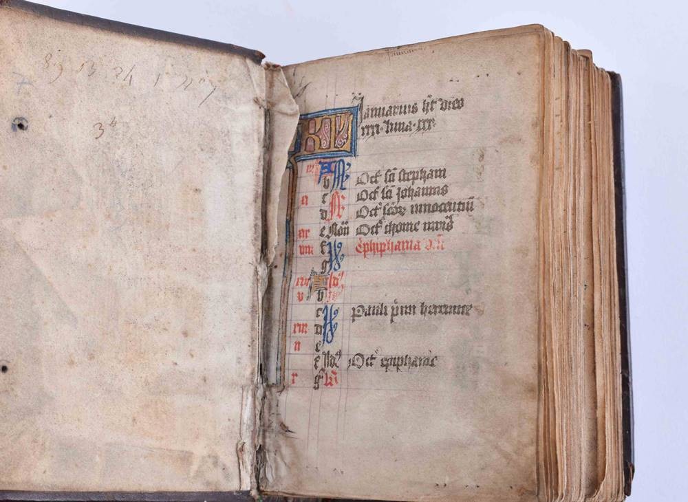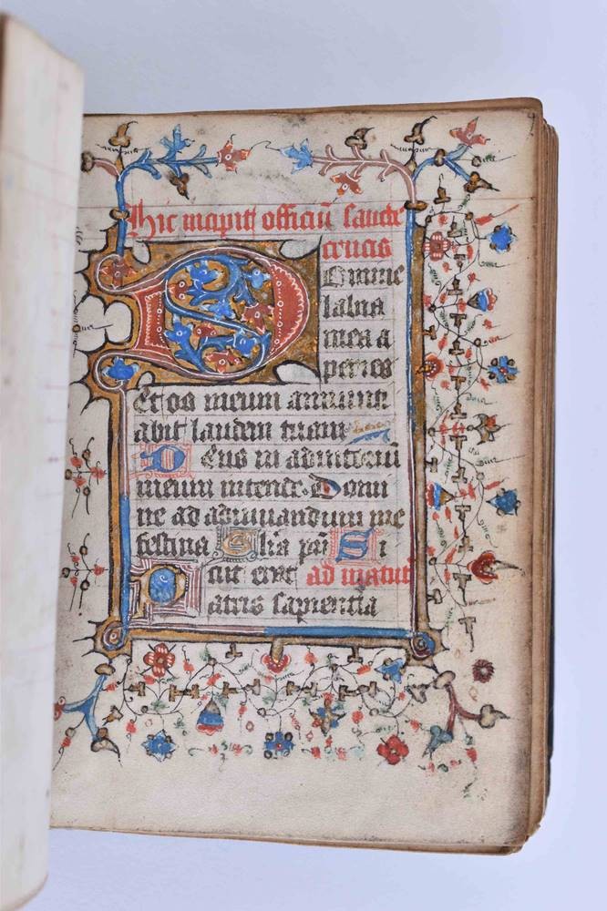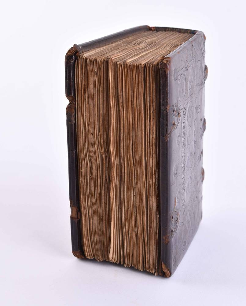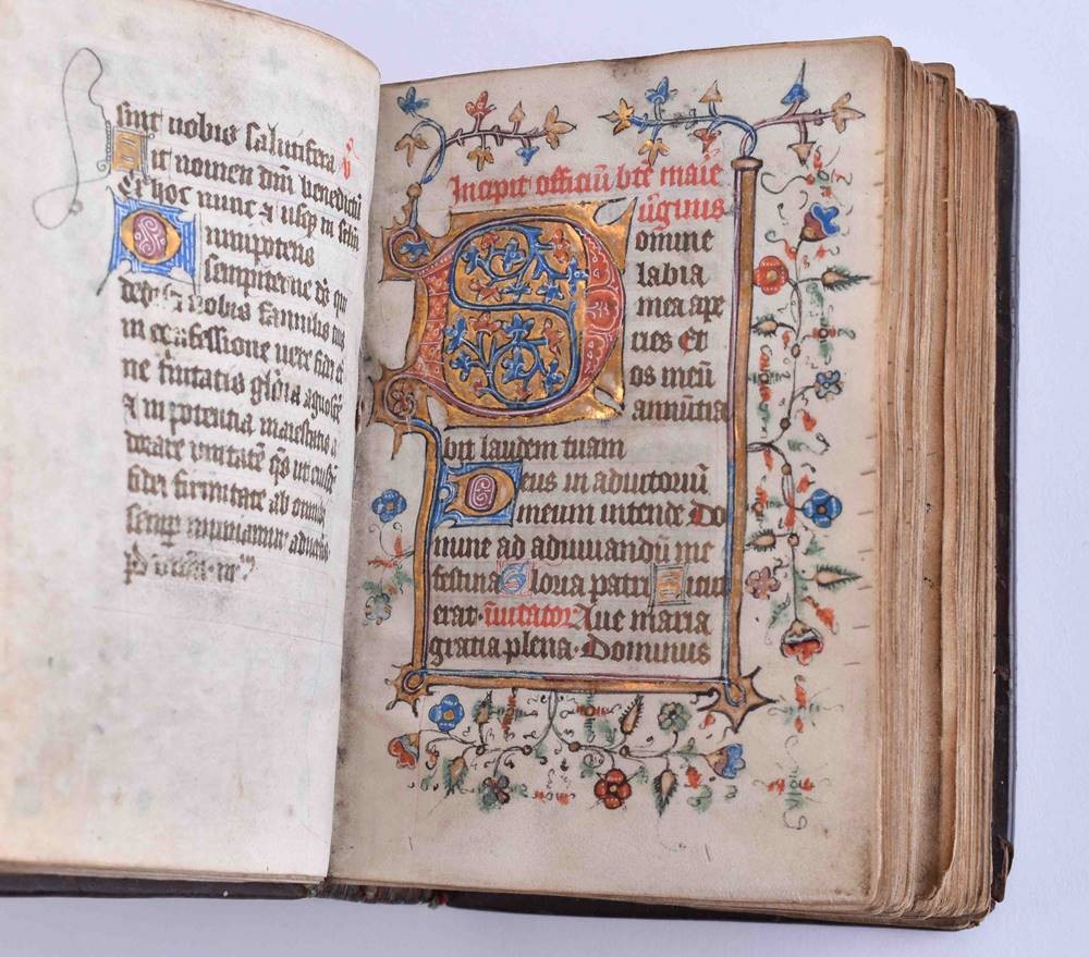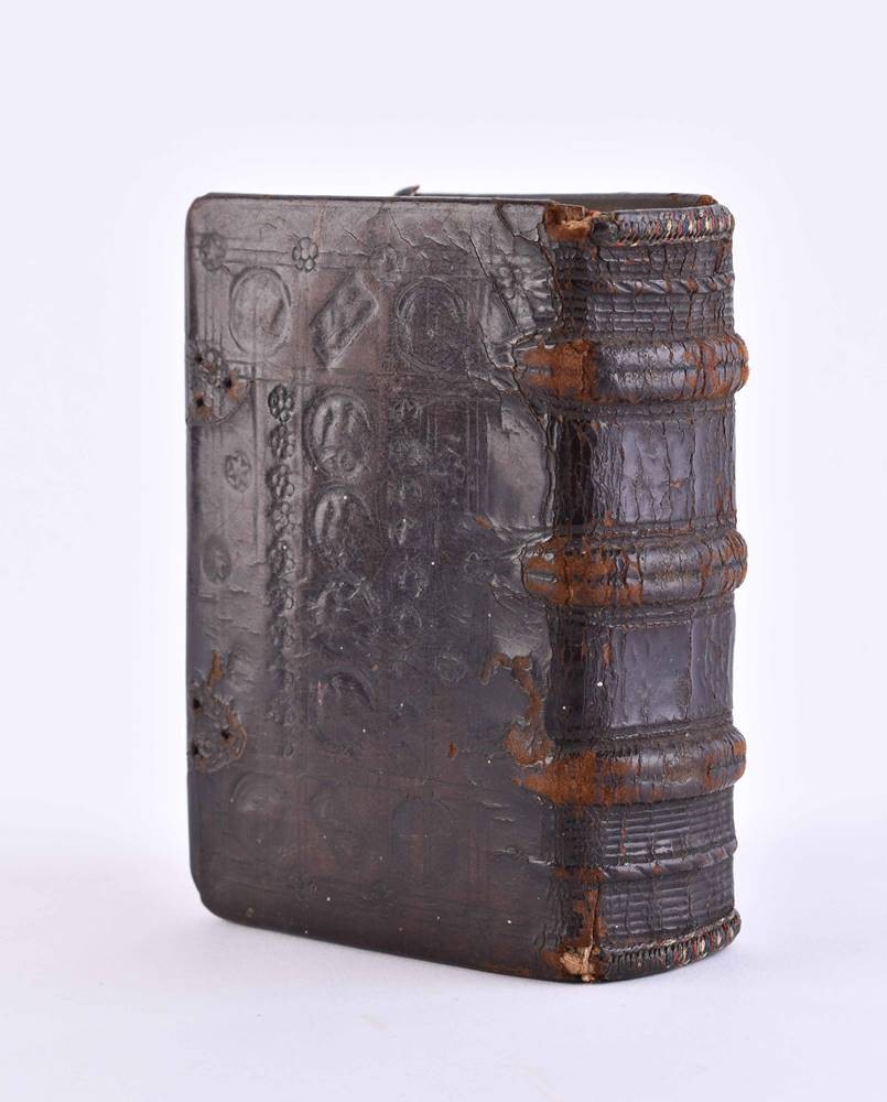 Handschrift auf Pergament, ca. 135 Seiten, im zeitgenössischen Ledereinband, sehr kunstvoll gestaltet, Schrift durchgehend in braunschwarzer Tinte von einer Hand, mit kunstvoller Illuminierung der Anfangsinitialen mit Verwendung von reichlich Blattgold, einige Hervorhebungen in Rot, im Format 11,5 cm x 8,5 cm x 4 cm