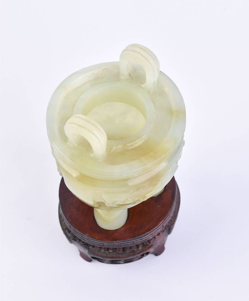 Green jade, surrounded by figurative and floral decor, with stand, total height: approx. 12 cm