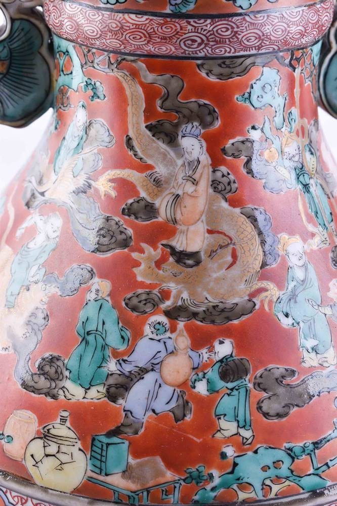 Porcelain, colorfully painted and gold decorated, with lateral handles in the shape of fish, surrounded landscape decor, bottom mark, ht: 29 cm