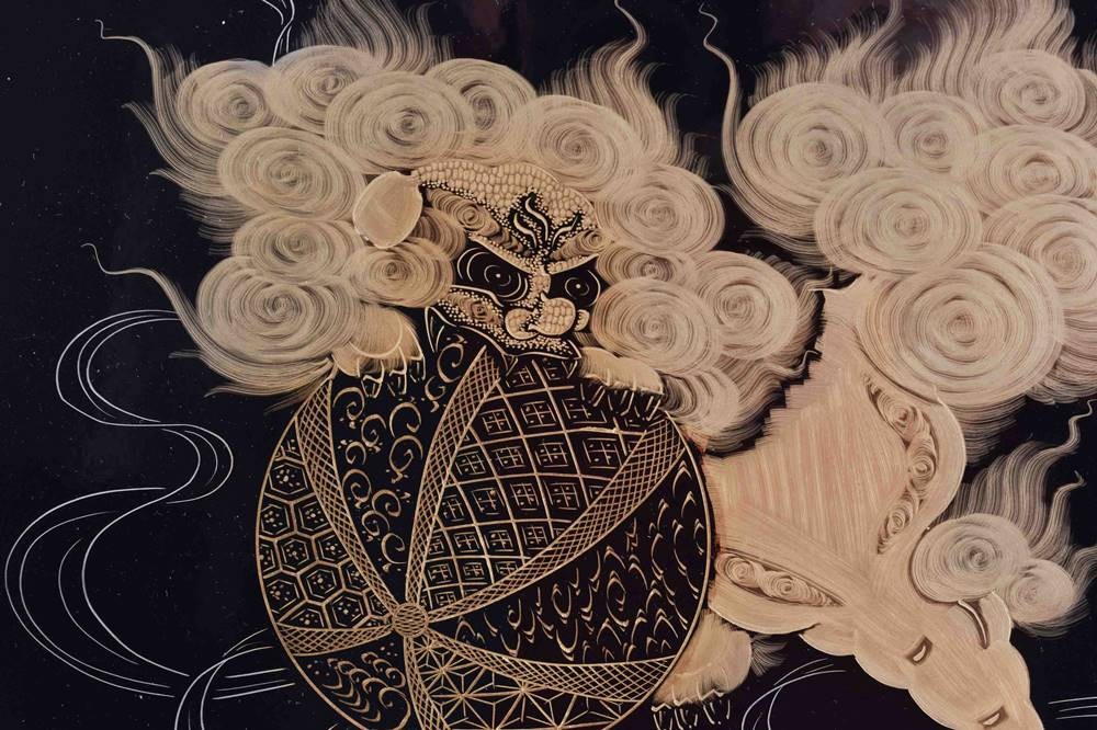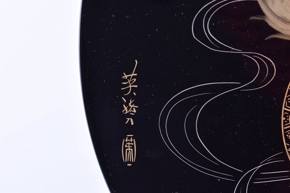 Fine lacquer painting with gold decoration, signed, on wood, Ø 39.5 cm, with hanger, OVP