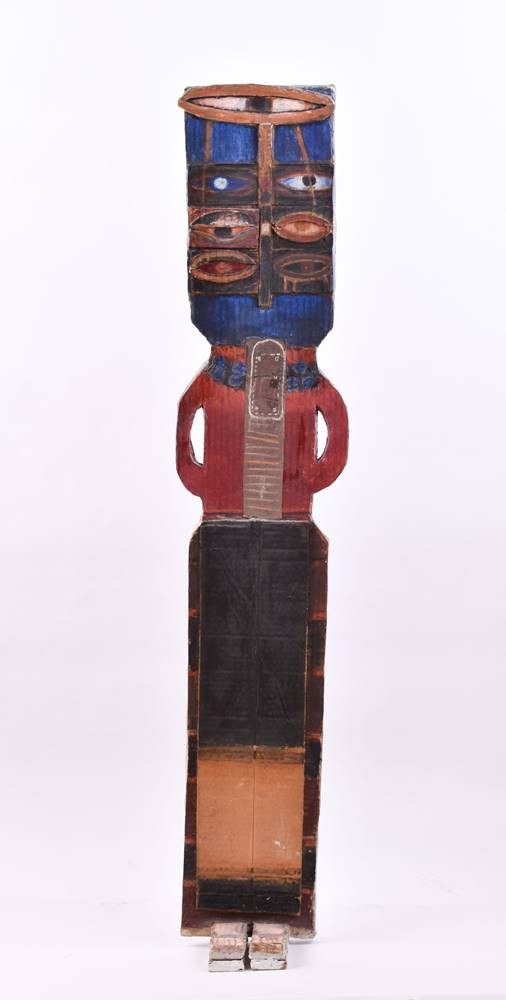 Stele made of corrugated cardboard, oil and collage, 107 cm x 18 cm x 3 cm
