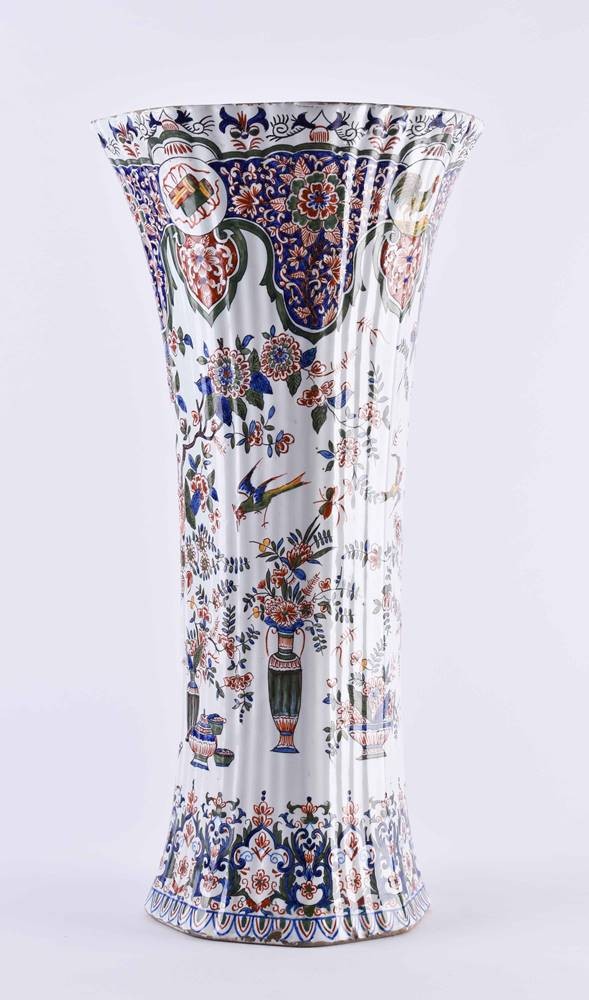 fayence with colorfully painted decor. ribbed body and surrounded with Asian decor. Base mark: K., ht: approx. 68 cm, Ø approx. 33 cm , Matching piece to previous lot..