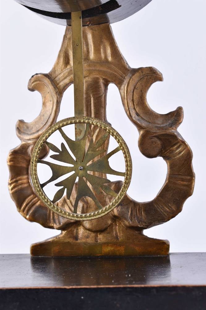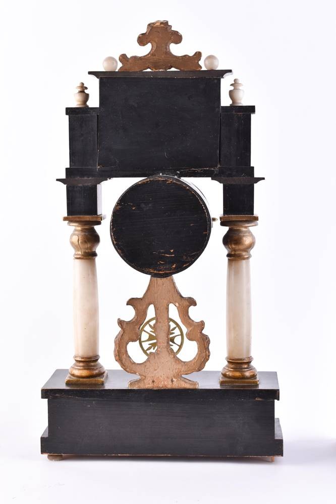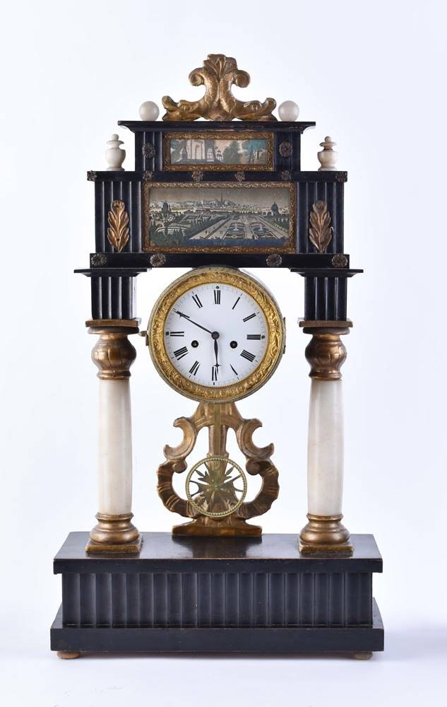 Enamelled clock face with Arabic numerals, wooden case, alabaster and bronze, partly fire-gilt, key present, 59 cm x 32 cm x 12 cm