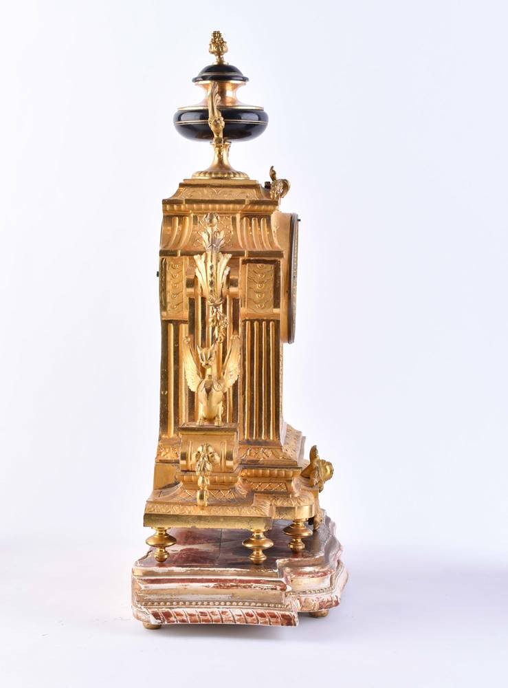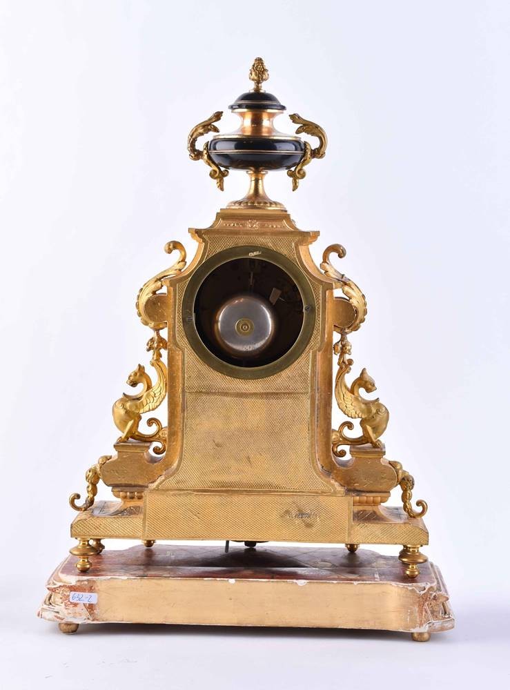 Fire-gilt bronze case, dial with Roman numerals, movement with strike on bell, key included, clock starts, rear glass cover missing, somewhat rubbed, 39 cm x 27 cm x 14 cm, standing on wooden pedestal, total height: 43.5 cm