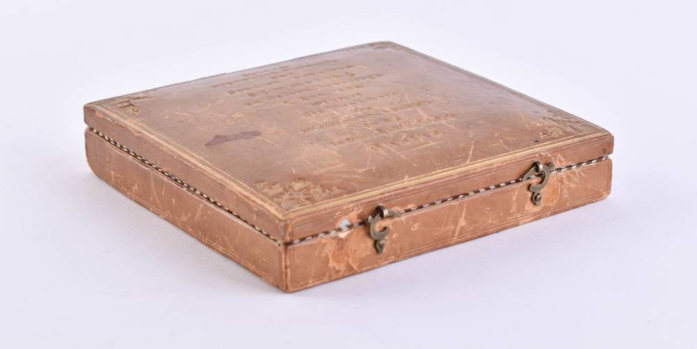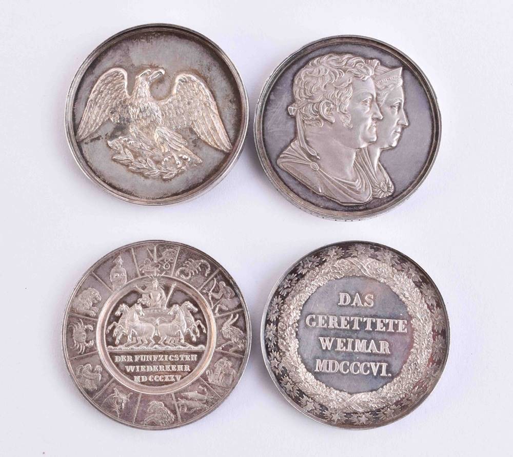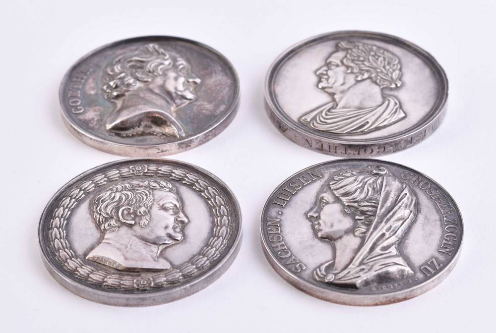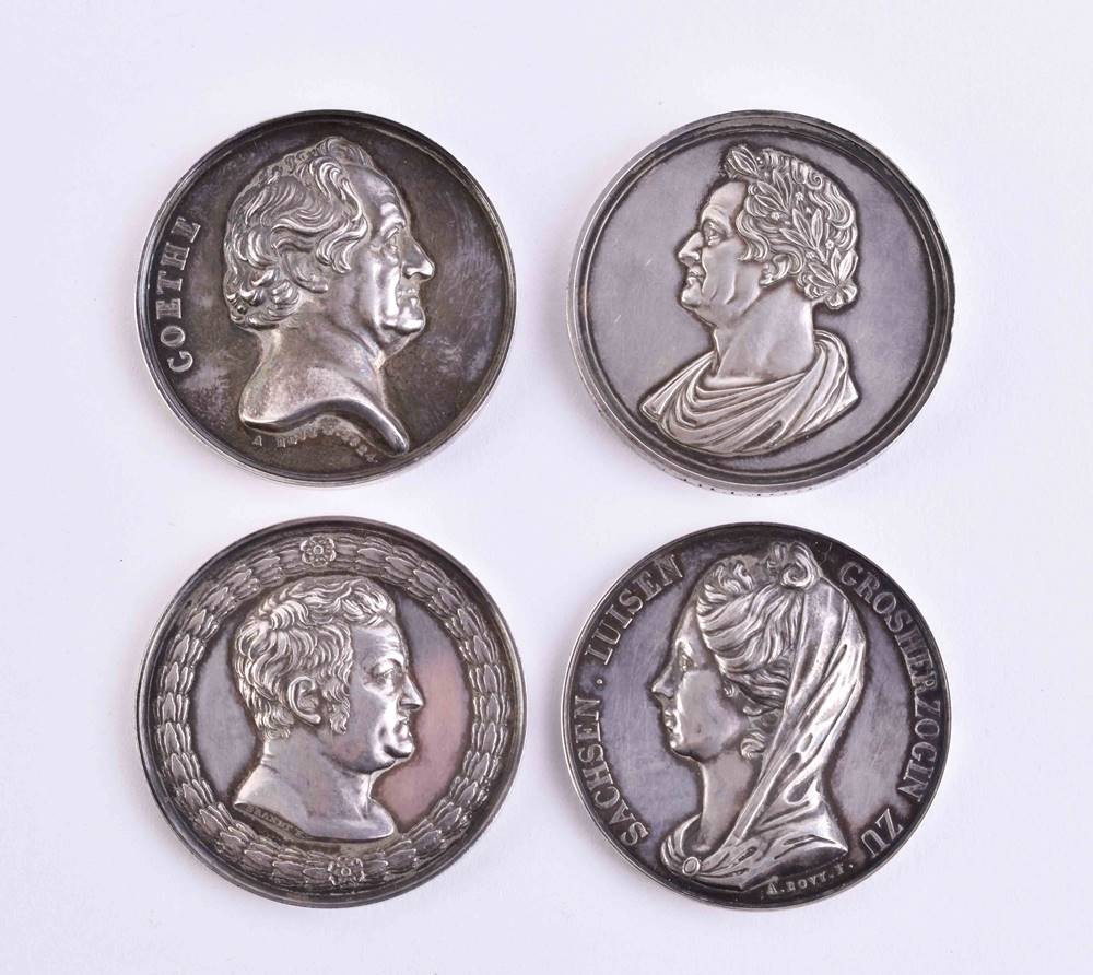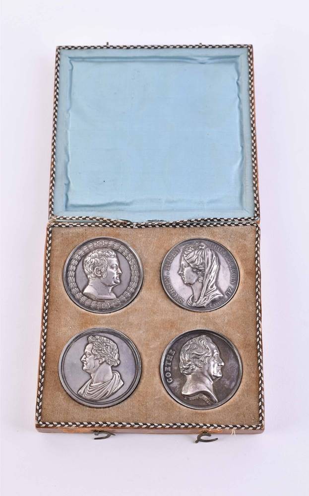 In a leather-covered wooden case (11.4 cm x 10.8 cm) with two clasps, contents: four silver medals, including 1 medal with the portrait of Grand Duke Karl August von Sachsen Weimar Eisenach on the occasion of the 50th anniversary of his reign, signed Brandt (weight 36.2 g., Ø 41.5 mm), 1 medal with the portrait of Grand Duchess Luise of Saxony Weimar Eisenach, thanksgiving medal of the city of Weimar for the protection against the French plundering in 1806, signed A. Bovy (weight 36.2 , Ø 41 mm), 1 medal with the portrait of Goethe, historical commemorative coinage for the 50.The medal is signed Brand and 1 medal by Antoine Bovy (1795-1877) with the portrait of Goethe on the obverse, an eagle on the reverse, minted in 1824 (weight 36.7 g, Ø 40.9), all medals in excellent condition, silver casts of these medals are very rare. A gift from Goethe for the graduation of Samuel Thomas von Sömmerring 7 April 1828, gold-stamped dedication on the cover. A very personal gift from Goethe to his friend Sömmerring of great cultural-historical value.