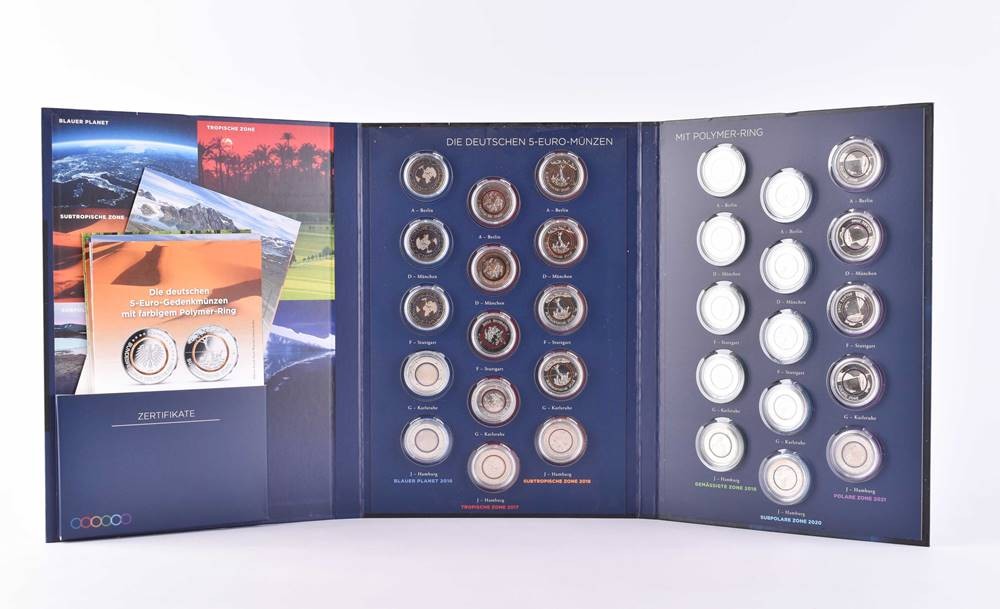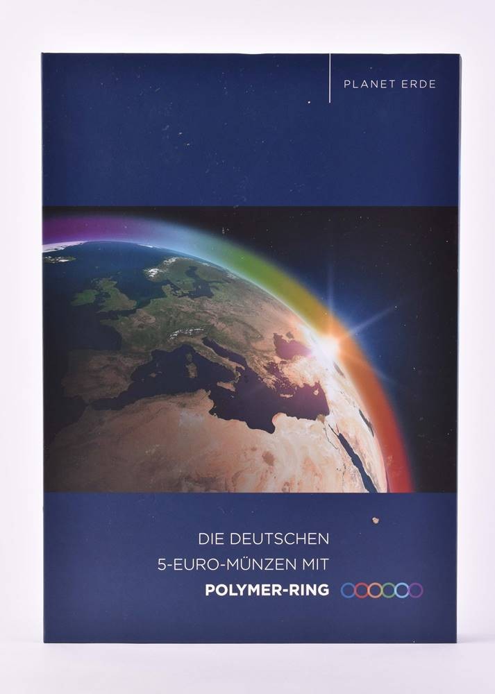 30 5 euro pieces blue planet 2016, tropical zone 2017, subtropical zone 2018, temperate zone 2019, subpolar zone 2020 and polar zone 2021, all 5 mints Berlin, Munich, Stuttgart, Karlsruhe and Hamburg, with colorfully painted polymer ring, brilliant uncirculated in original blister pack