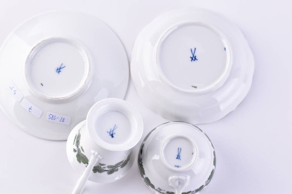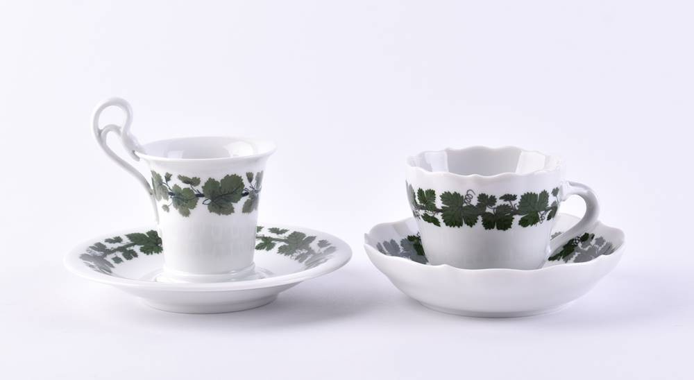 Porcelain, decor vine leaves, blue crossed swords mark, 1st choice, cup height 5.3 cm & 5.5 cm