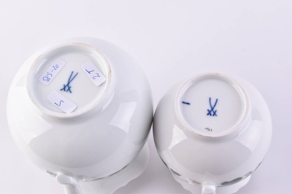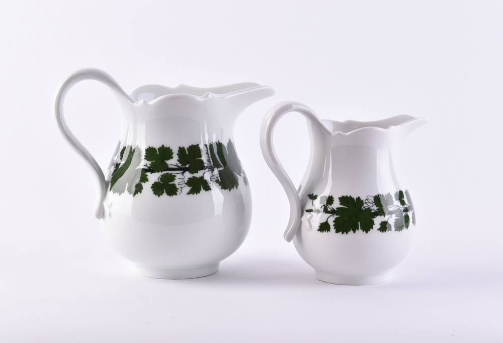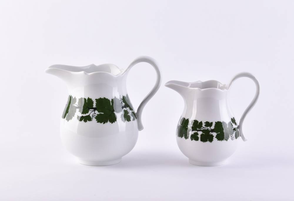 Porcelain, decor vine leaves, blue crossed swords mark, 1st choice, 1 cream jug 12 cm, 1 milk jug 14 cm