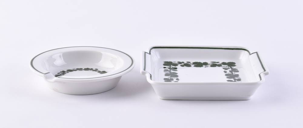 Porcelain, decor vine leaves, blue crossed swords mark, 1st choice, round Ø 9 cm, square 11 cm x 10 cm