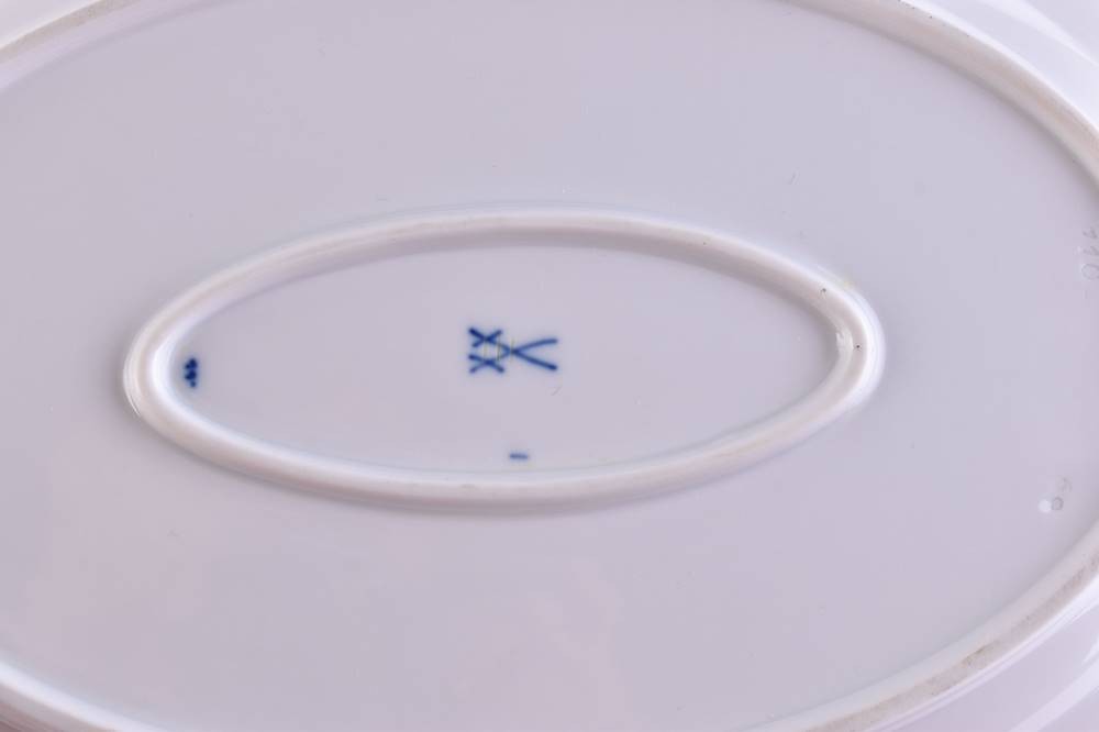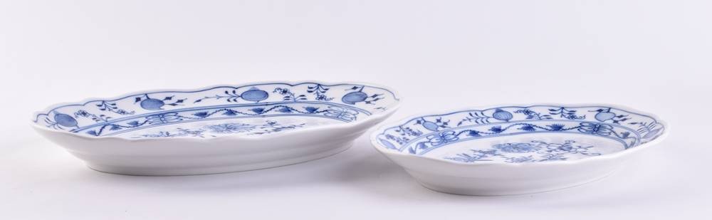 porcelain offering plates, colorfully painted, onion pattern decor, oval, 3 cm x 26.5 cm x 19 cm and 3.5 cm x 30.5 cm x22.5 cm, blue crossed swords mark, 3 grinding strokes