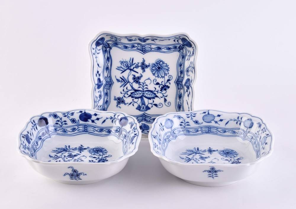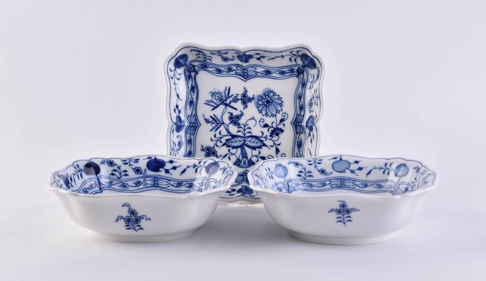 Porcelain, onion pattern decor, swords mark, 3 grinding strokes, 1 bowl (3.5 cm x 17 cm x 17 cm) and 2 bowls (6 cm x 18.5 cm x 18.5 cm)