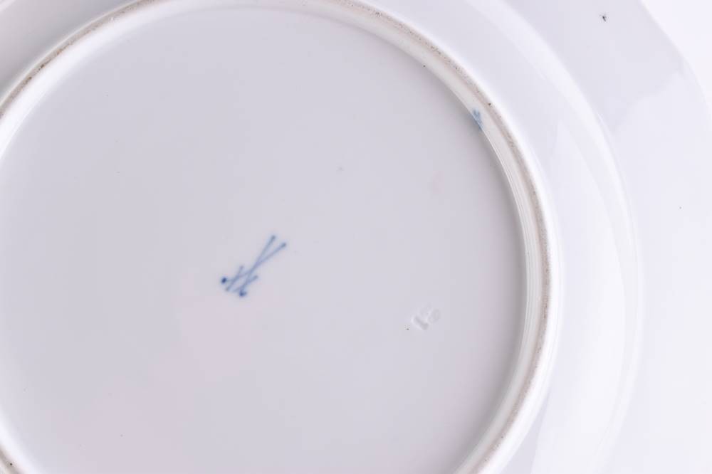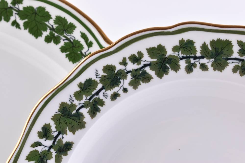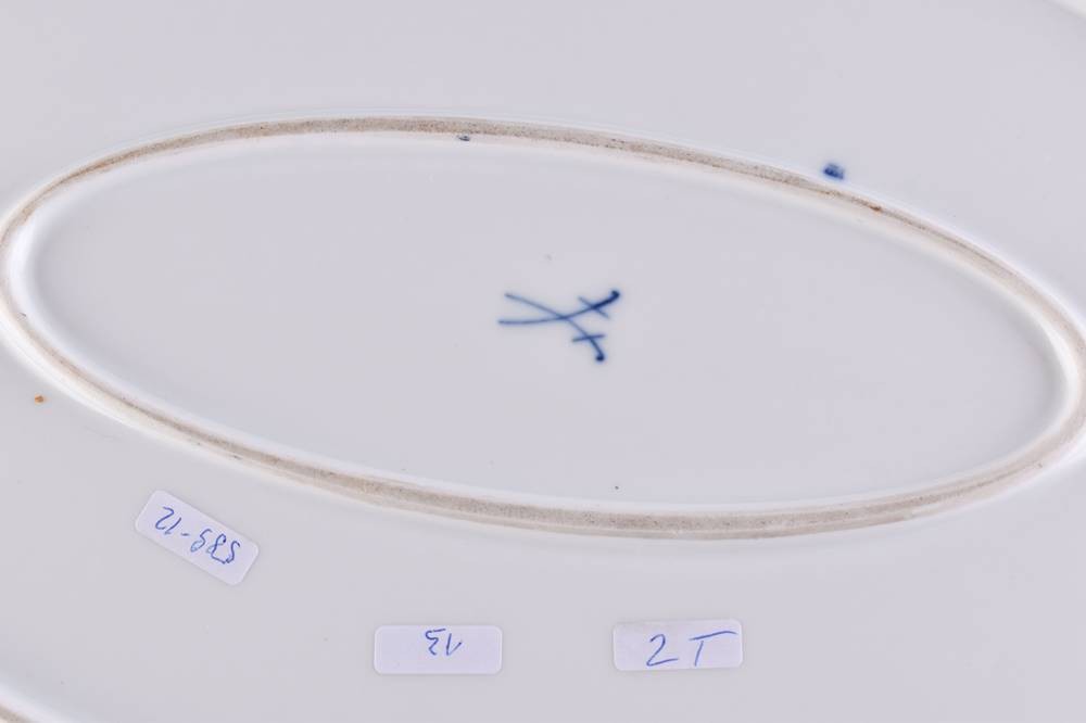 porcelain, 2 pieces, decor vine leaves with gold rim, 1 large serving plate height 5 cm x 41.5 cm x 30 cm, 1 dinner plate Ø 25 cm, blue crossed swords mark, 1st choice