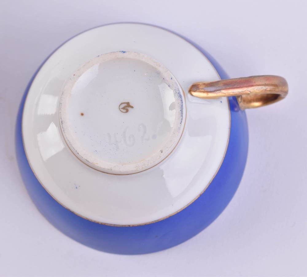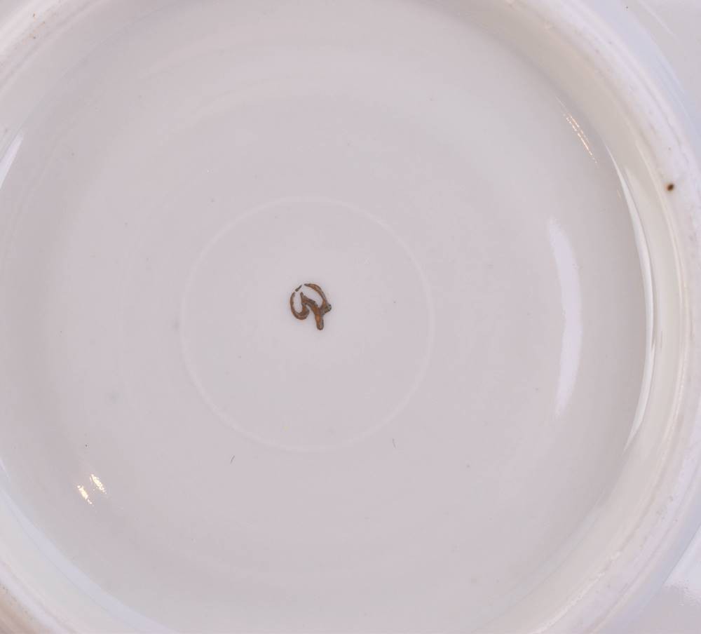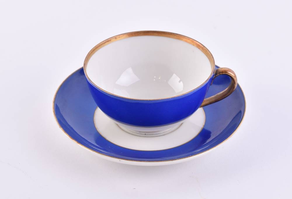 Porcelain, colorfully painted and gold decorated, one cup (ht: 3.7 cm), one saucer (Ø 11 cm), with bottom mark