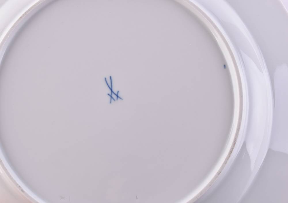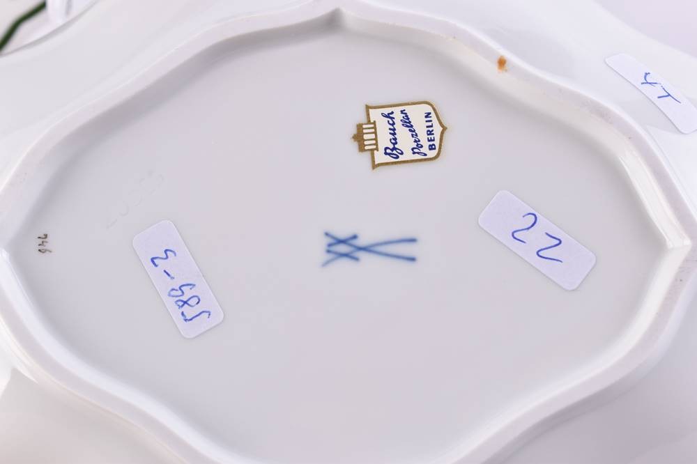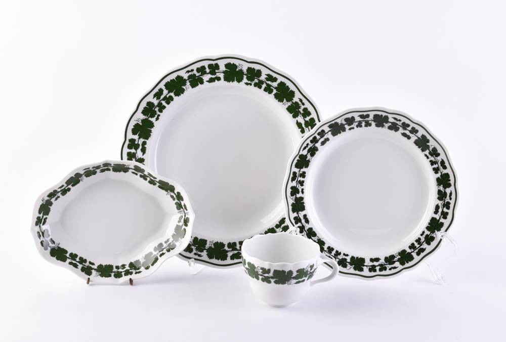 porcelain, 4 pieces, decor vine leaves, 1 coffee cup height 6.5 cm, 1 serving bowl height 3.5 cm x 18 cm x 14 cm, 1 dinner plate Ø 20 cm, 1 dinner plate Ø 25 cm, blue crossed swords mark, 1st choice