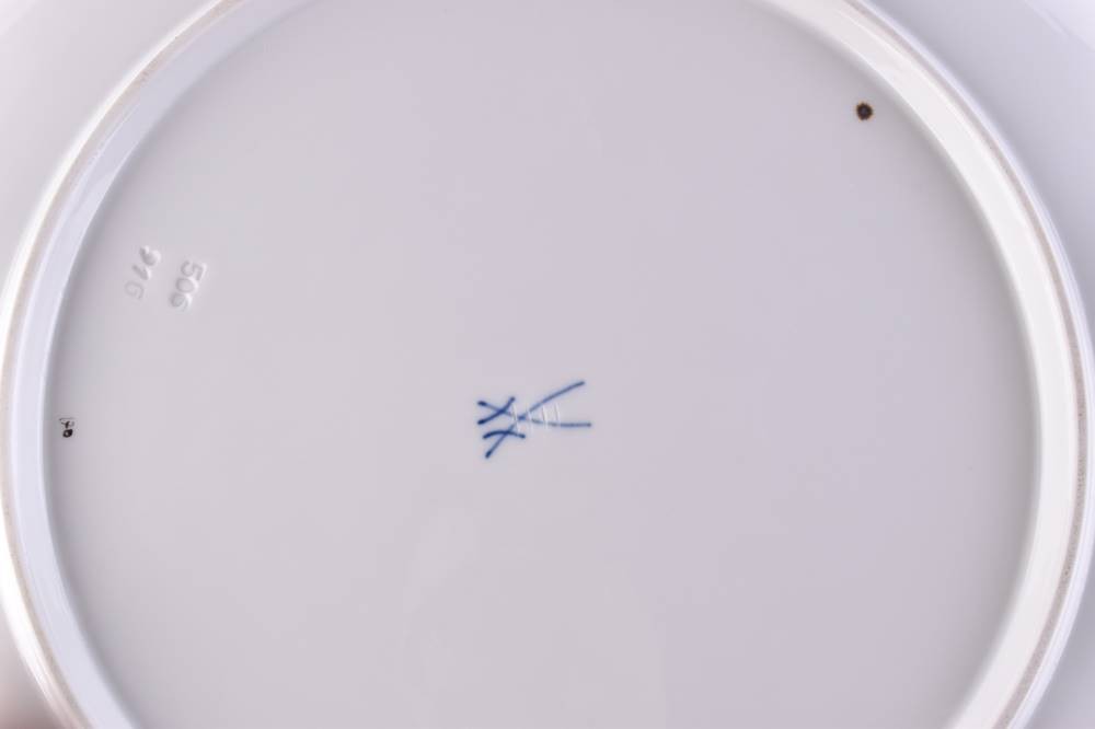 Porcelain, 2 pieces, decor vine leaves, 1 large cake plate height 4 cm x Ø 28 cm, 1 serving plate height 4.5 cm x 26.5 cm x 18.5 cm, blue crossed swords mark, deputation