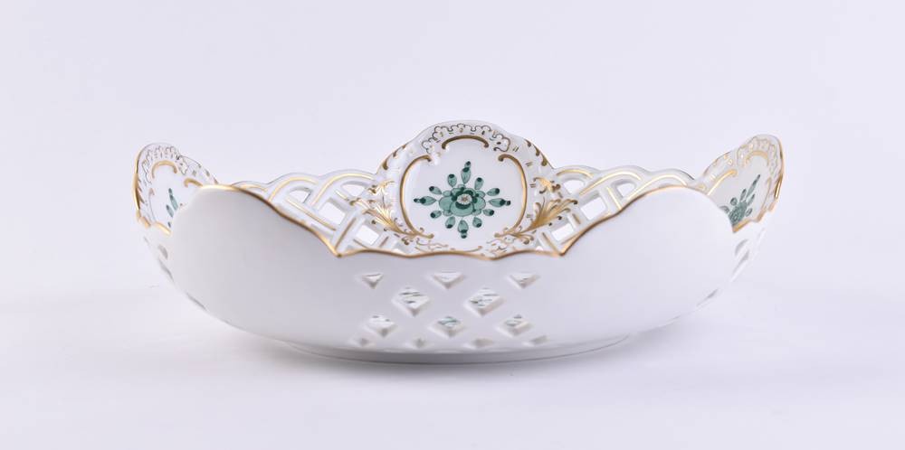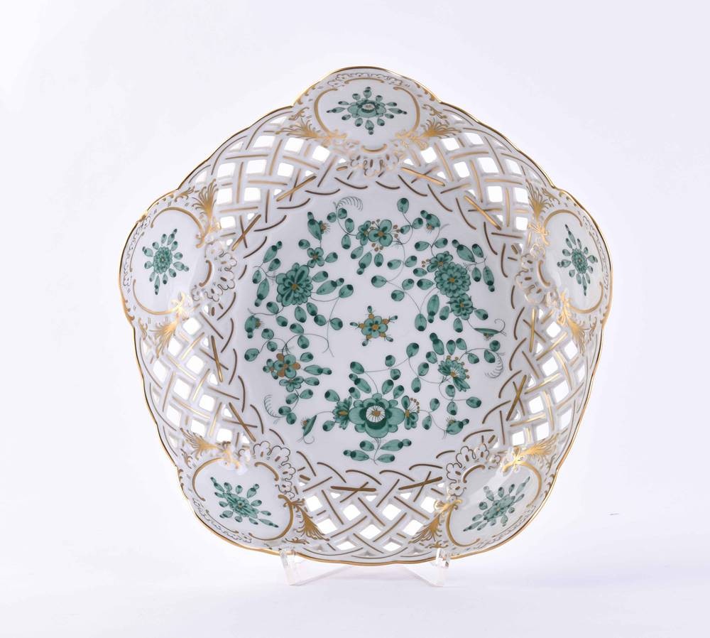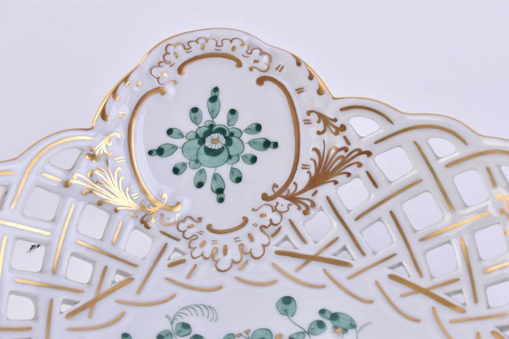 Porcelain, colorfully painted and gold decorated, Indian green decor, swords mark, 2 grinding strokes, ht: 6.5 cm, Ø 23 cm