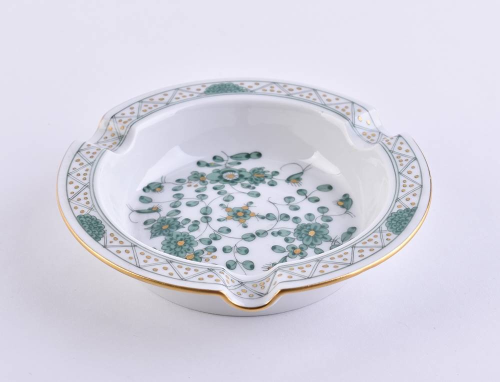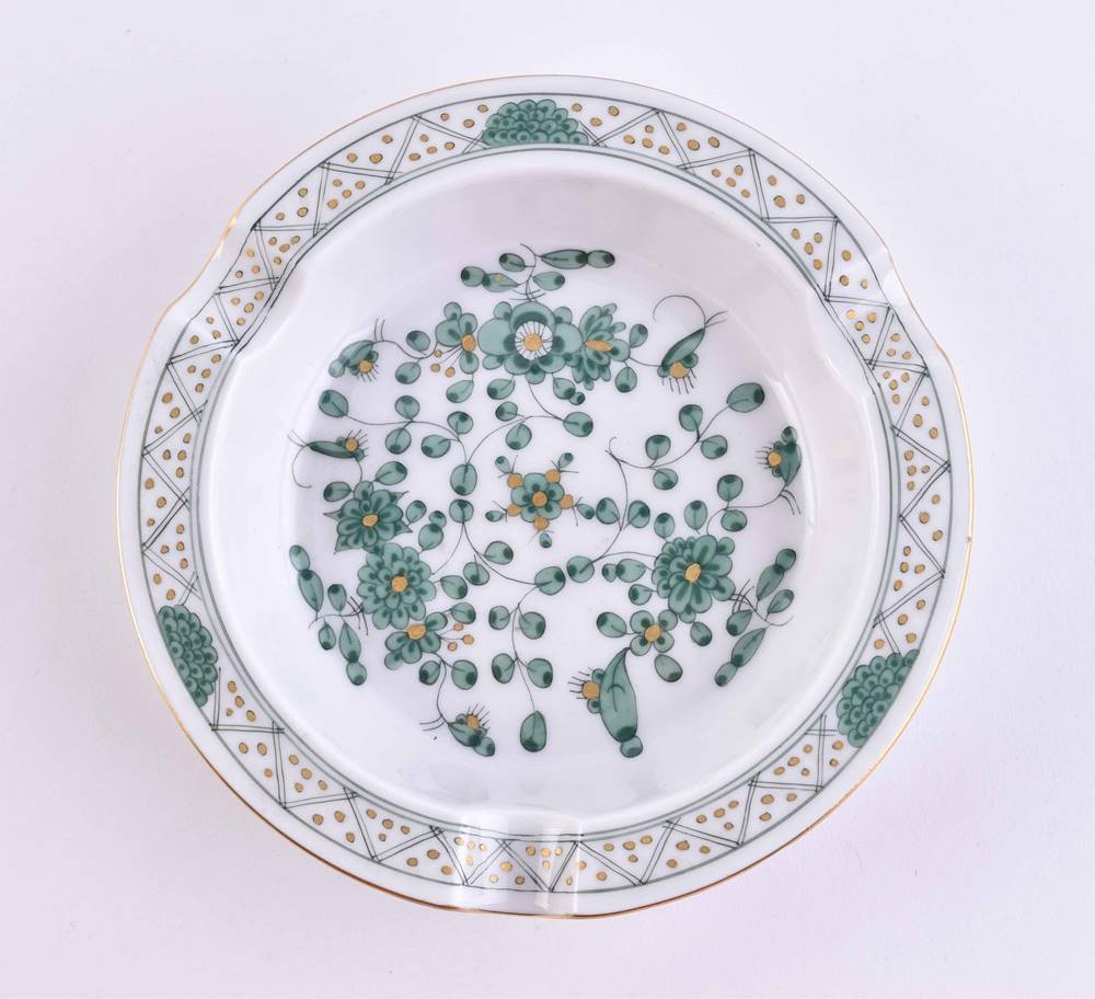 Porcelain, colorfully painted and gold decorated, Indian green decor, swords mark, 2 grinding strokes, ht: 2.5 cm, Ø 12.5 cm