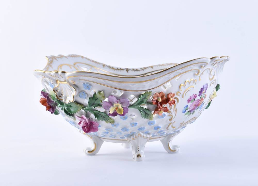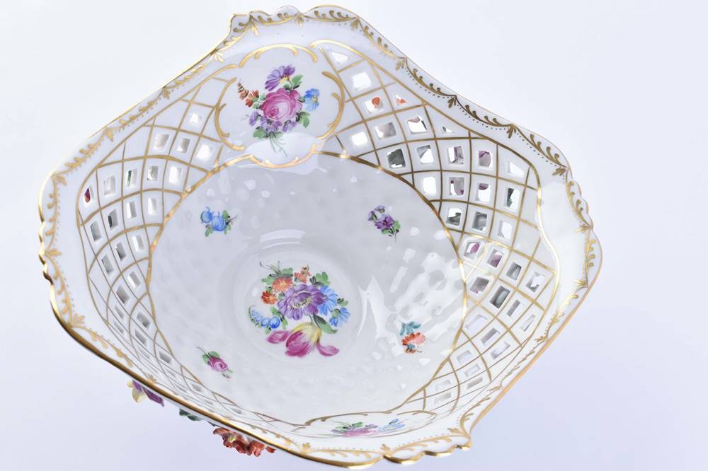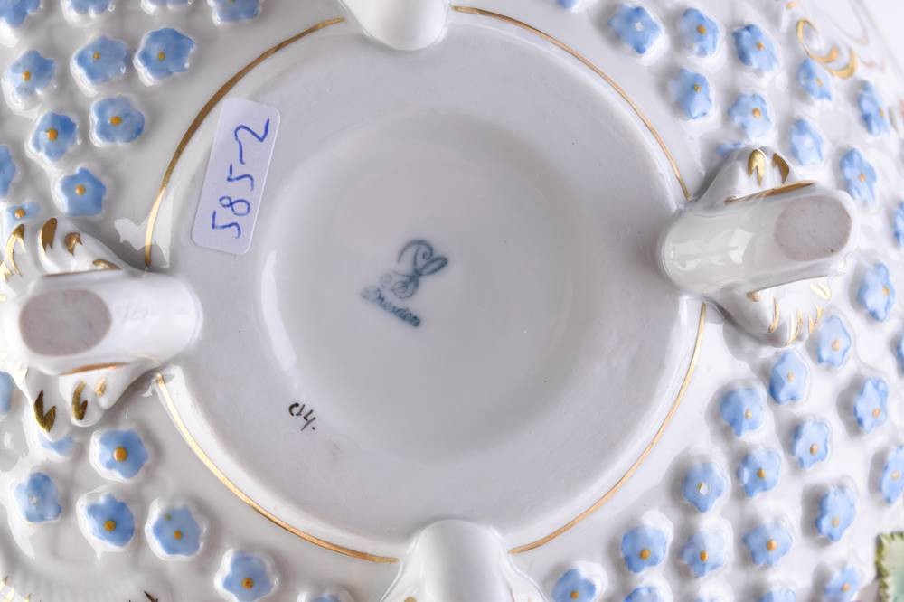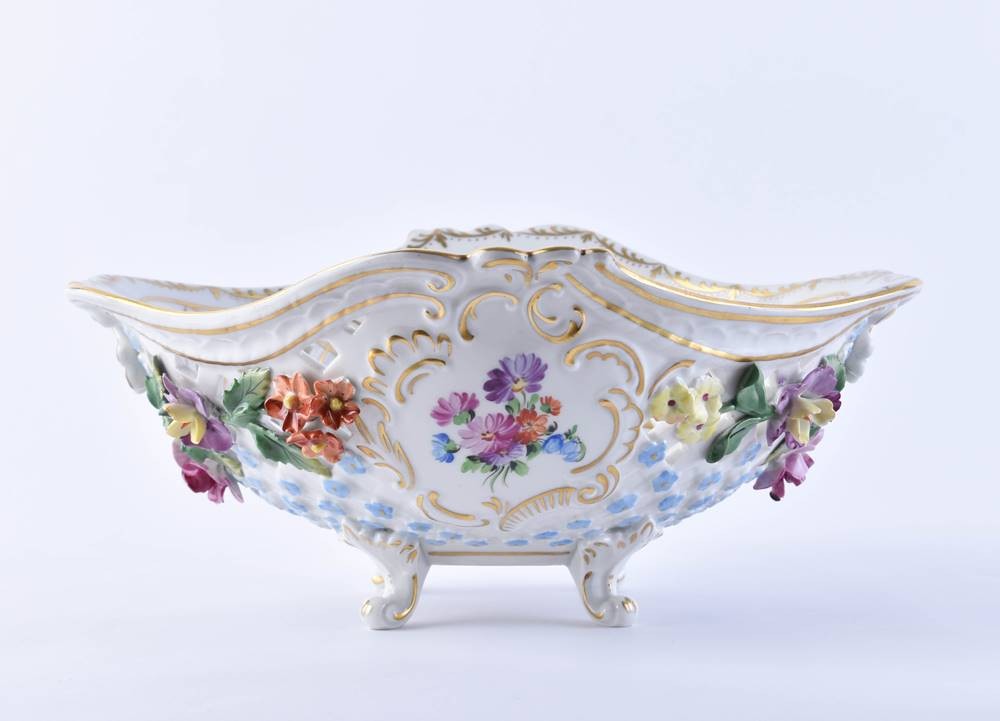 Porcelain colorfully painted and gold decorated, German flower bouquet inside and outside in the reserves, surrounded with plastically applied flower tendrils and forget-me-not decor, bottom mark