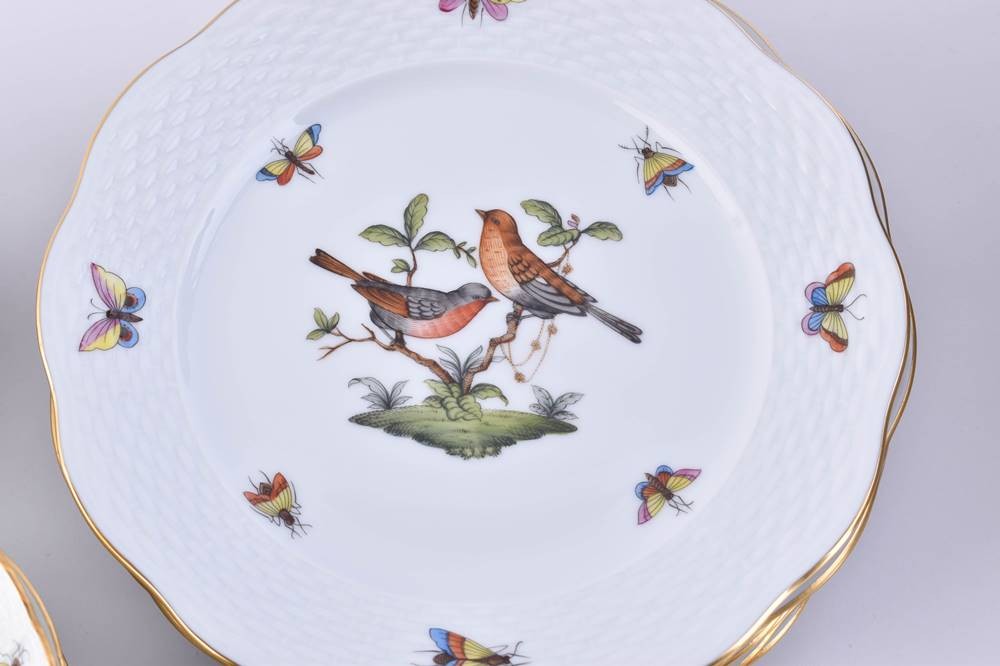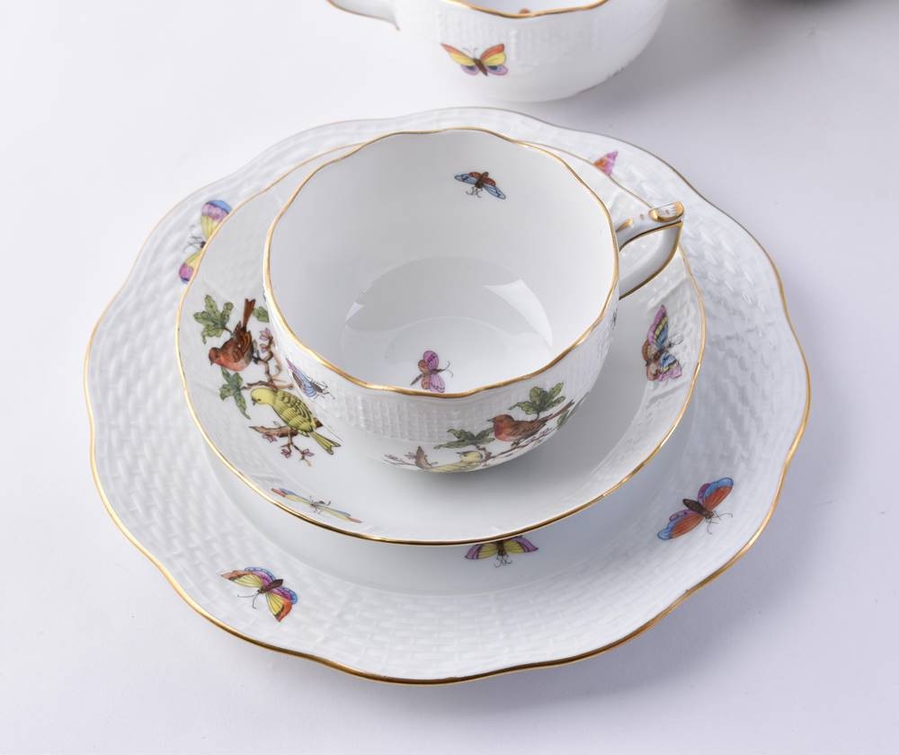 Porcelain, 6 pieces, colorfully painted and gold decorated, Rothschild decor, 2 cups (ht: 5.3 cm), 2 saucers (Ø 13.7 cm), 2 cake plates (Ø 19 cm), with bottom mark, 1st choice