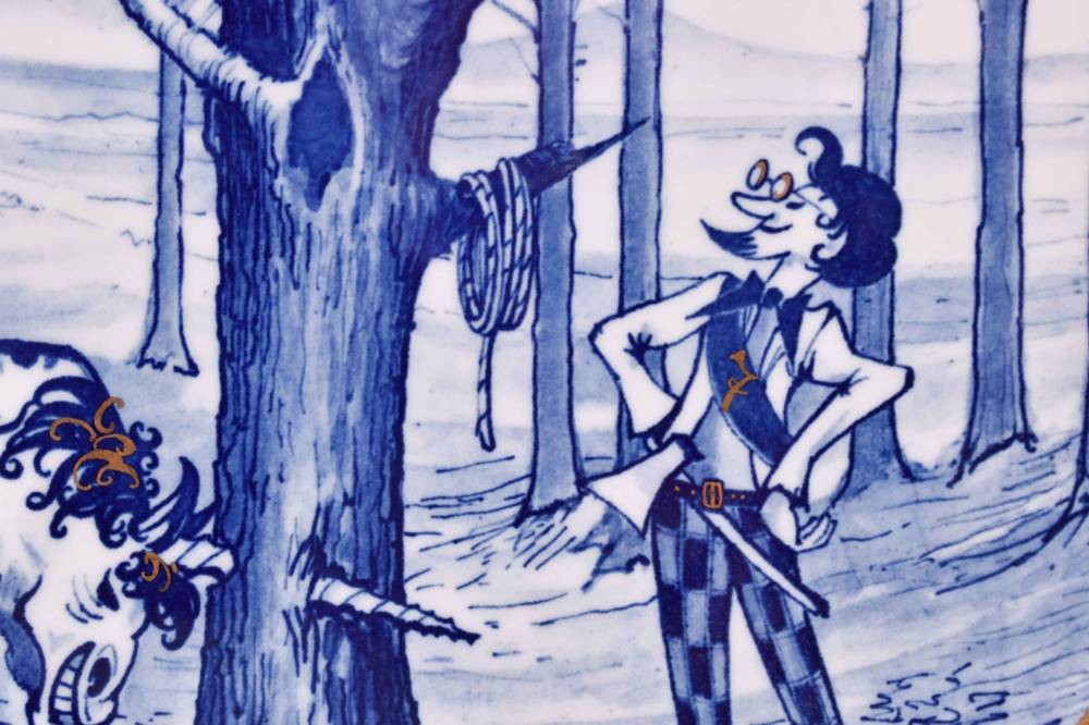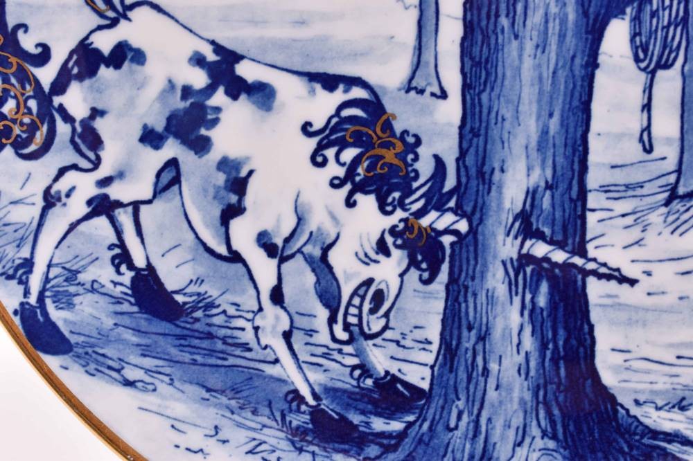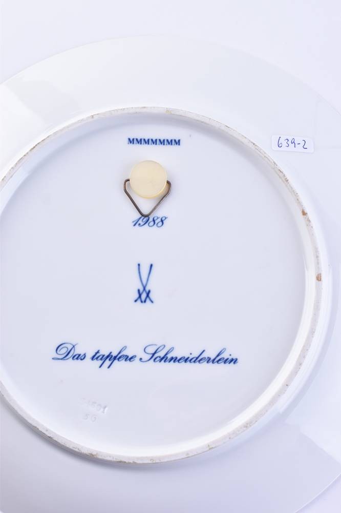 Porcelain, "The Brave Little Tailor", colorfully painted and gold decorated, blue crossed swords mark, 1st choice, Ø 25.5 cm