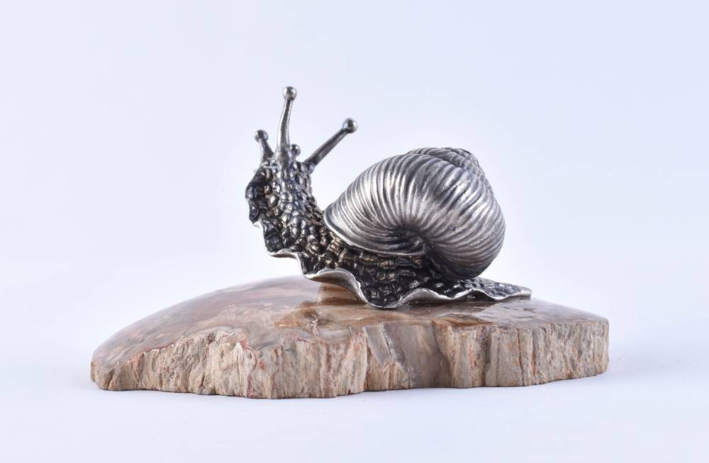 Snail, silver 84 Zolotnik, Cyrillic master's mark, on agate base, total height: 5 cm, total weight approx. 140 g.