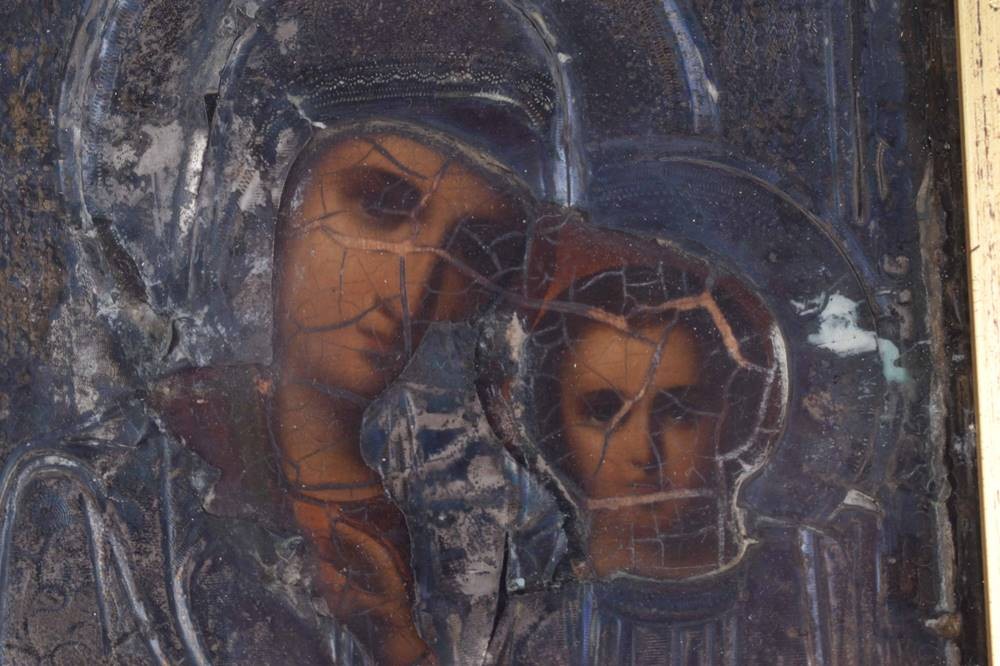 Mary with the infant Jesus, egg tempera on wood with silver oklad 84 Zolotnik, Cyrillic master's mark, 17.5 cm x 14 cm,