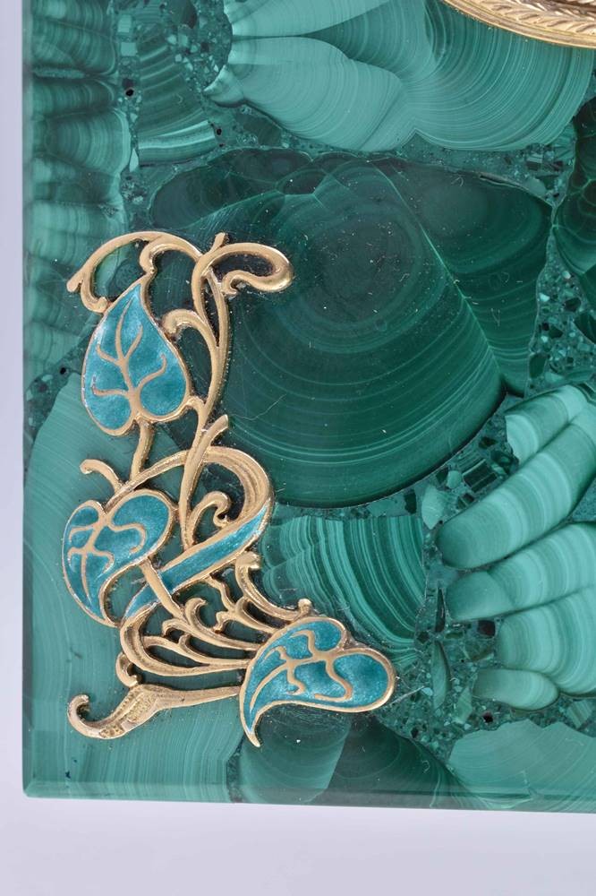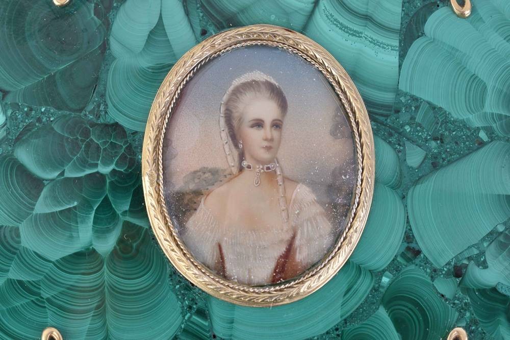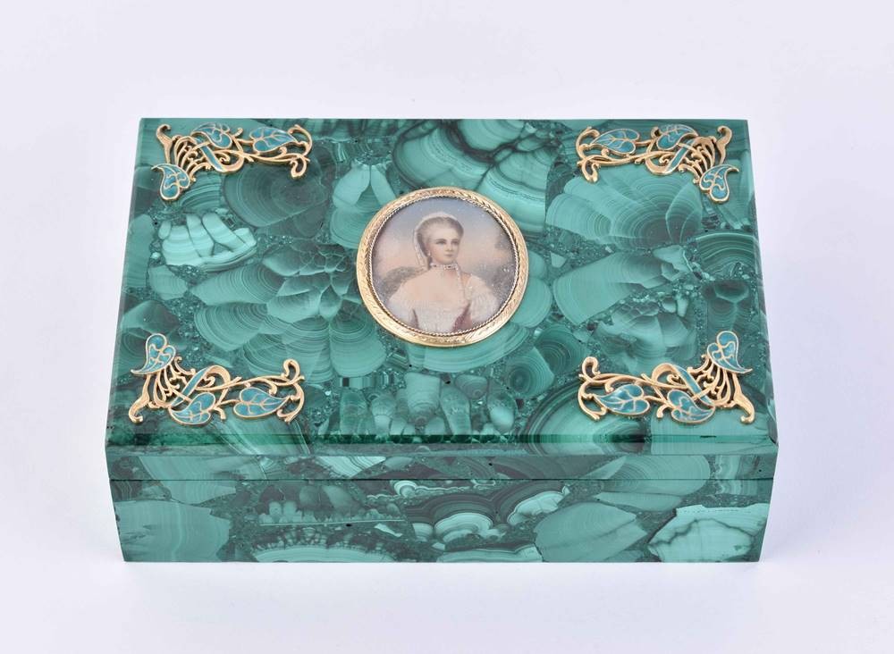 Lid decorated with gilded silver applications, finely painted portrait of a lady in the centre, framed in gilded silver mount, partly enamelled, silver 88 Zolotnik, Cyrillic master's mark, hinged lid, approx. 4.7 cm x 14.6 cm x 9.8 cm
