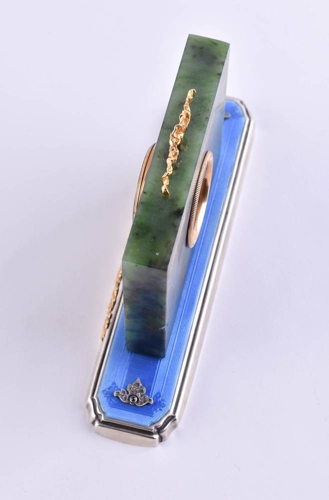 Nephrite jade and silver partly gilded 88 Zolotnik, stand decorated with blue gouilloch enamel, diamonds and rubies, key included, overall dimensions: 9.5 cm x 15 cm x 4.5 cm