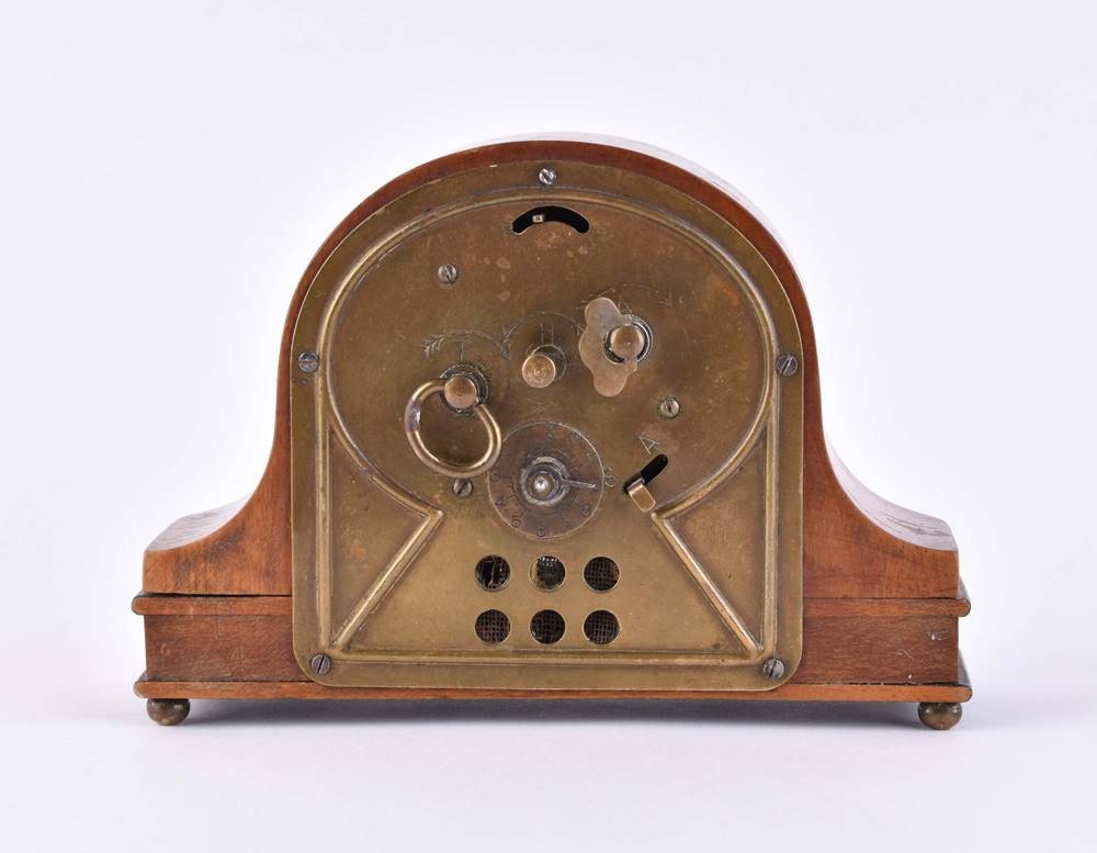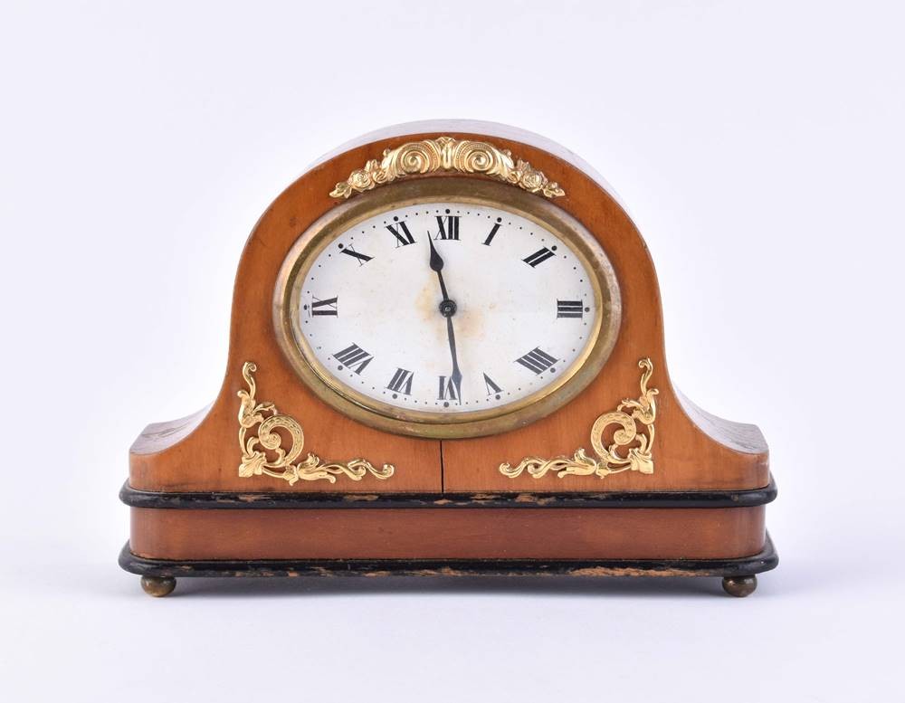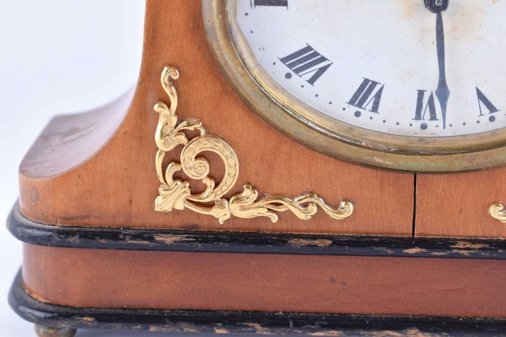 Wooden case, dial with Roman numerals, wooden case decorated on the front with gilded silver application, silver 84 Zolotnik, Cyrillic master's mark, standing on four ball feet, clock runs on approx. 10.2 cm x 14.5 cm x 4.5 cm