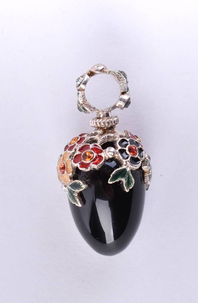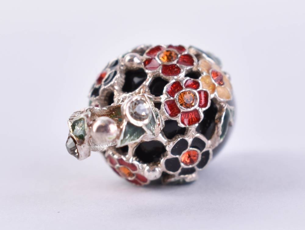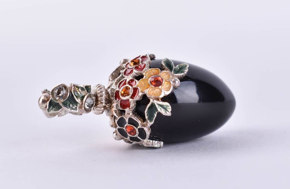 Silver tested, semi-precious stone, enamelled, surrounded with various colorfully painted stones, length: 3 cm