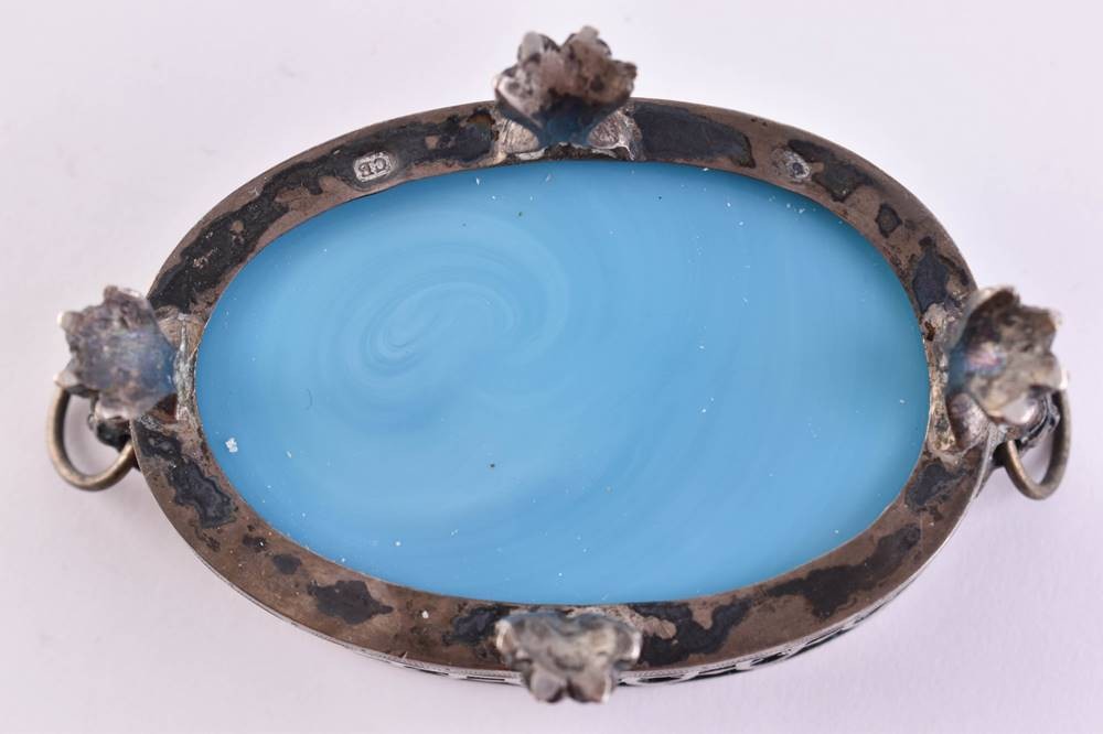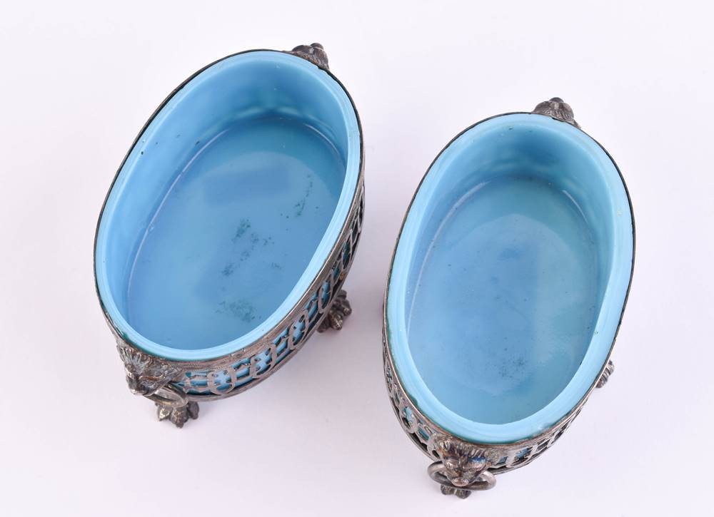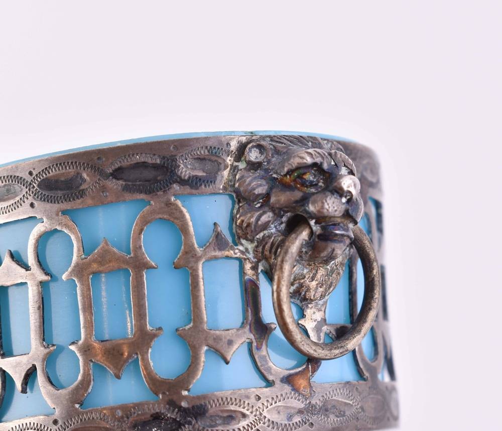 Silver mount with glass body, standing on four feet, each with two lateral handles in the shape of lion heads, probably Augsburg, hallmarks cb and L each with pine cone, 4.5 cm x 8 cm x 5 cm