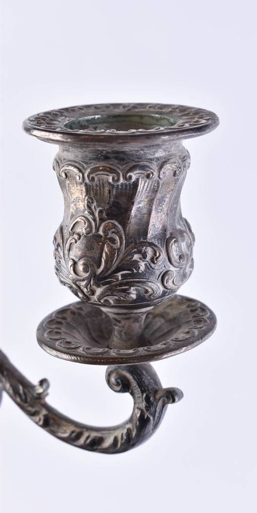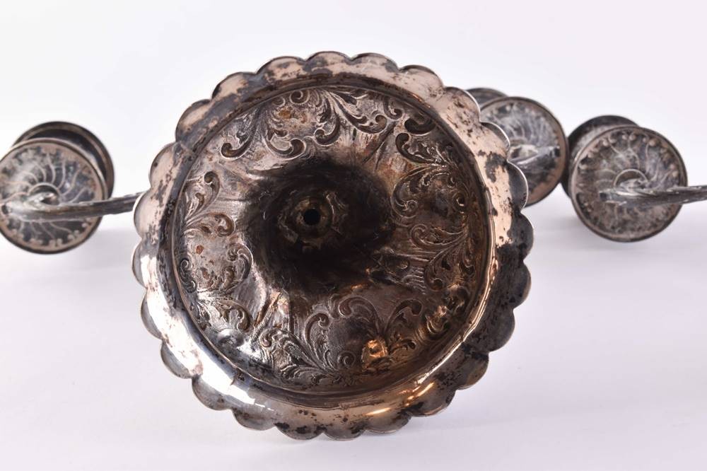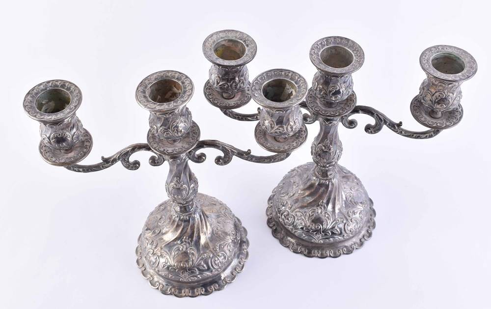 Silver 800/000, 3 flames each, ht: 22.5 cm, width: 22.5 cm, unfilled, weight approx. 1250 g.