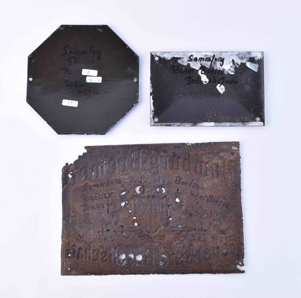 Sheet metal, Hamburg-Bremer Feuer-Vers. Gesellschaft(23.5 cm x 16.8 cm) poor condition, Hier schützt Allianz, octagonal( Ø 15 cm) very good condition, Versichert bei Reiffeisendienst( 10 cm x 15 cm) good condition