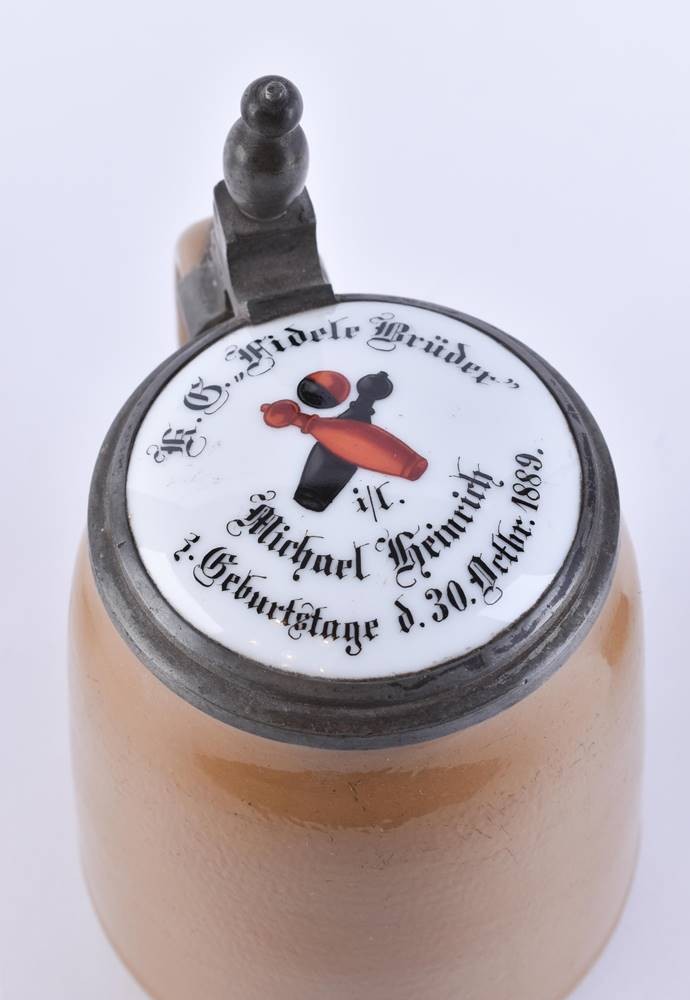 Brown glazed ceramic, porcelain picture plate framed in the tin lid - skittle club " Fidele Brüder ", thumb rest as skittle, dated 1889, ht: 16.5 cm