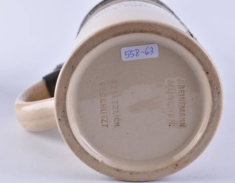 Ceramic, colorfully painted and glazed, pewter lid and thumb rest, with motto, bottom mark, legally protected, ht: 20 cm
