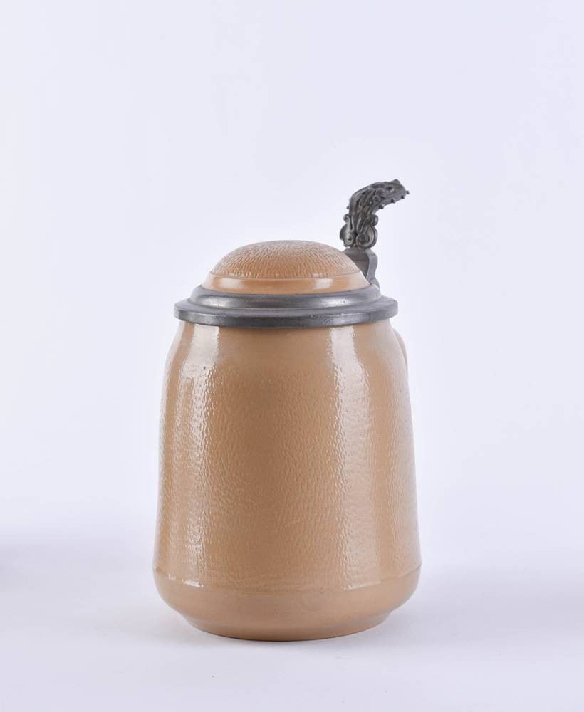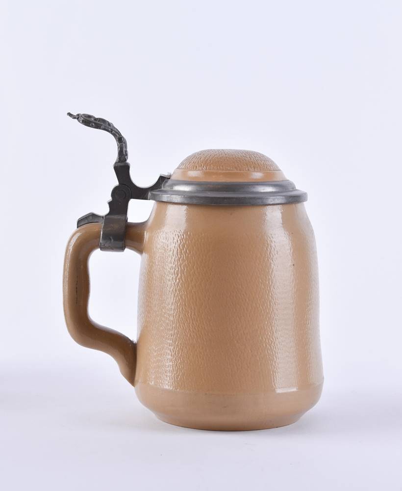Brown glazed ceramic, tin-framed lid, thumb rest, green bottom mark, model no. 1400, ht: 15.5 cm