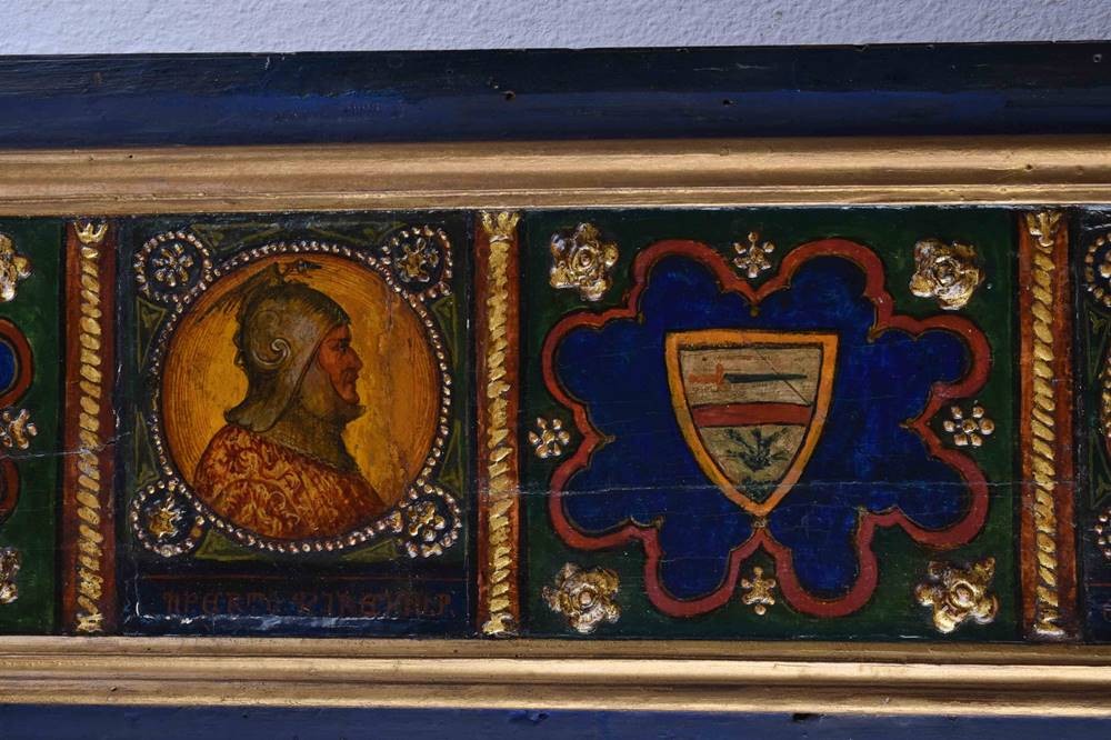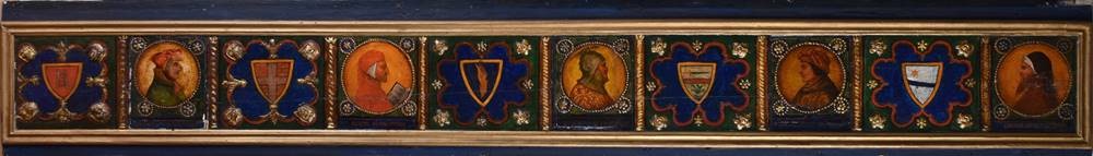 Wood, painted in oil colours with coats of arms and portraits of various lords, 33 cm x 225 cm