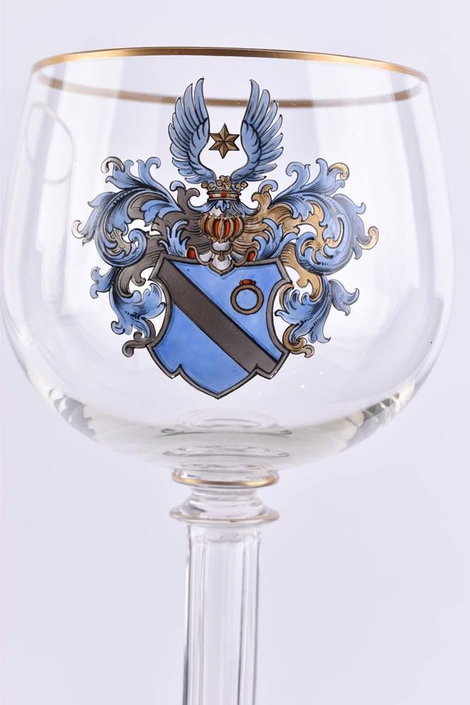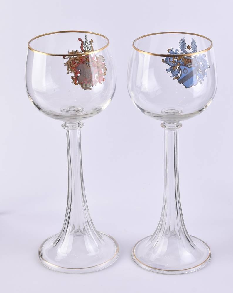 schauseitig farbig und gold staffiert mit Emaille Malerei, einmal Wappen der Braut und einmal Wappen des Bräutigams, Goldrand, H. je 32 cm