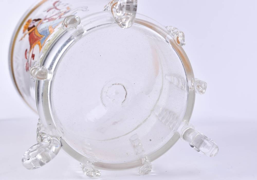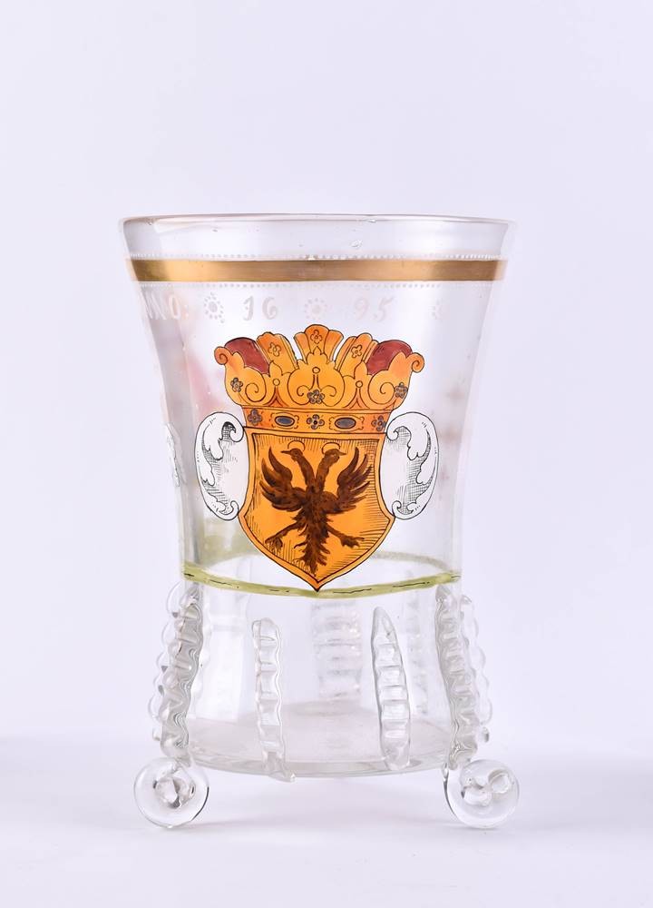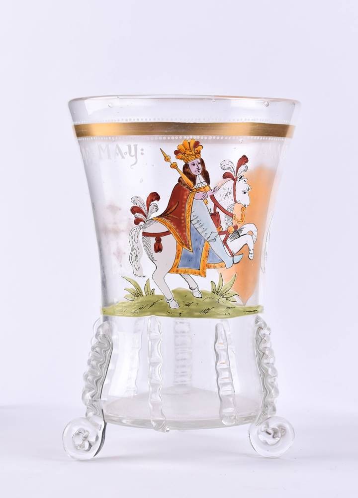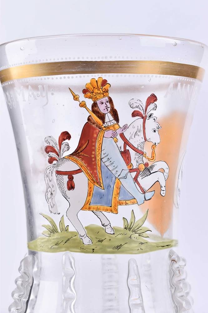 Glas, mit opaken Emailfarben bemalt und vergoldet, der König zu Pferde, Aufschrift: RÖM: KAJ: MAY: ANNO 1695, verschliffener Abriss, H: 19 cm