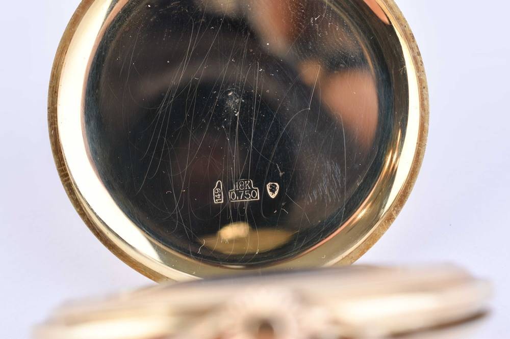 750 Gelbgold, drei Deckel Gold, Emaille Ziffernblatt mit arabischen Zahlen und schwarzen Zeigern, mit Handaufzug, ⌀ 47 cm, Gesamtgewicht ca. 80 g.