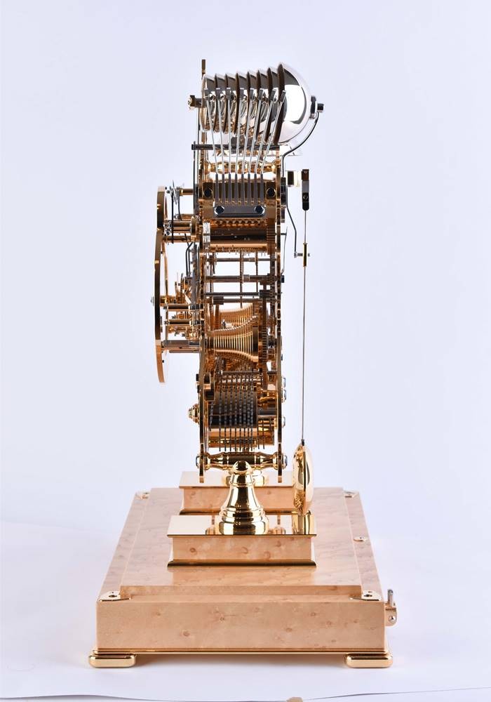 Mehrere Funktionen, darunter eine komplexe Gangschaltung mit einer Acht-Tage-Gangreserve, einem Läutewerk, das Melodien auf handgestimmten Glocken spielt, einem Ziffernblatt mit römischen Ziffern, eine Grahamhemmung mit Seiden- Suspensionspendel und ein Schlagwerk, das jede Stunde auf einer separaten neunten Tenorglocke schlägt.