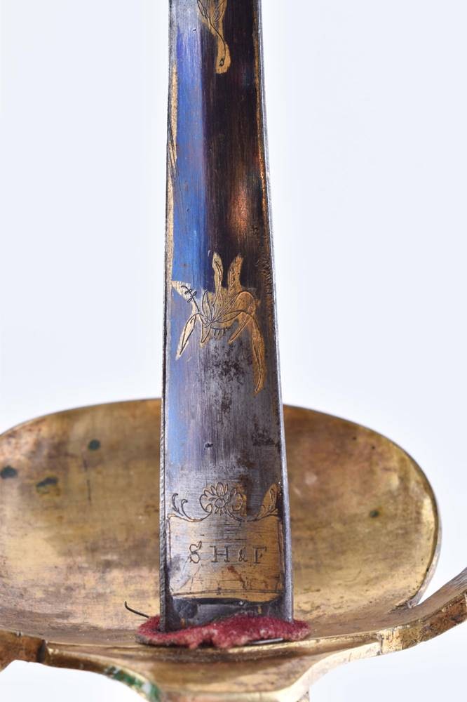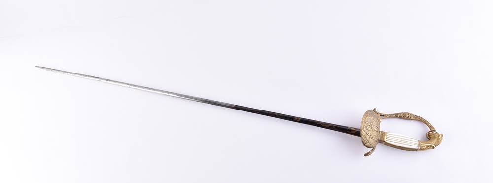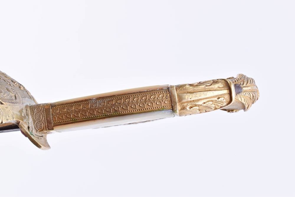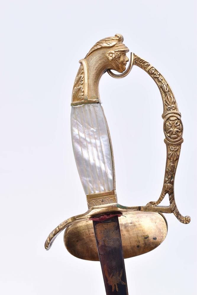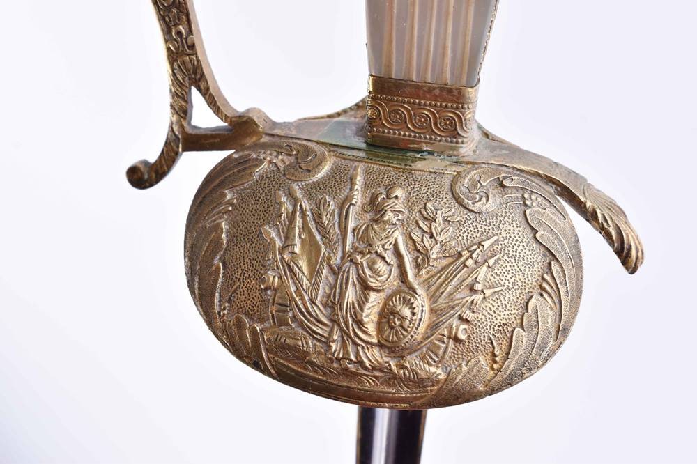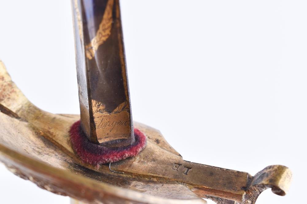 Griff Messing vergoldet. Griff mit 2 Perlmuttplatten belegt, Knauf in Urnenform. Griffbügel in Parierstange übergehend. Ortwärts gerichtetes Stichblatt mit antiker weiblicher Figur. Dreikantklinge mit Trophäendekor, a' Solingen- S H & F, Klingenlänge 72 cm, Gesamtlänge 83 cm