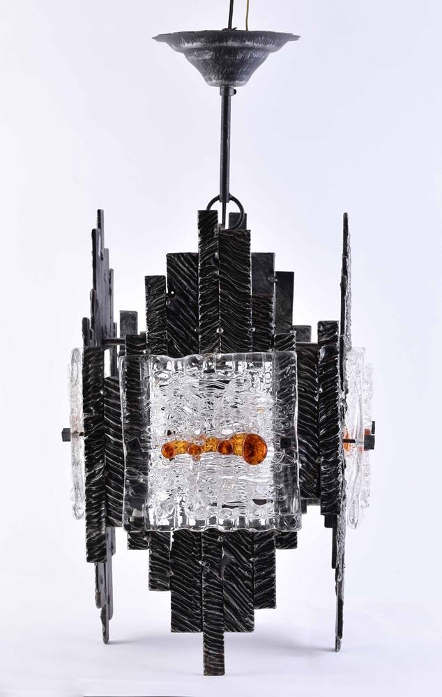 "Hängelampe im brutalistischem Stil um 1960/70", Schmiedeeisen und Moranoglas,