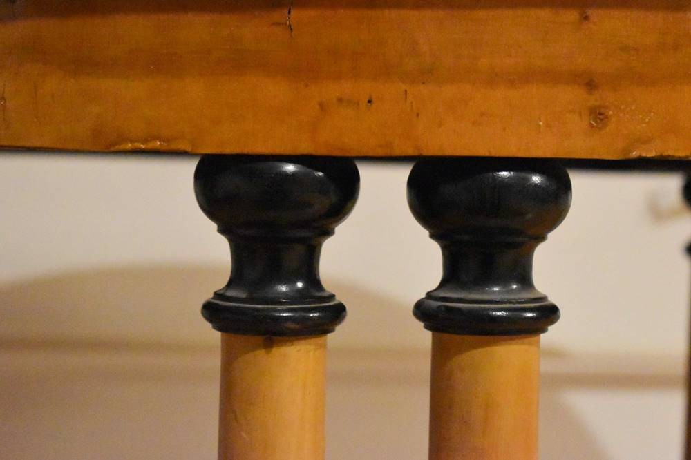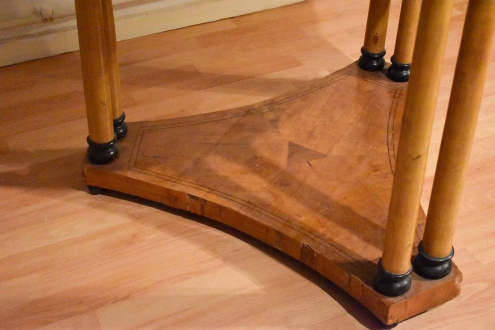 Runde furnierte Platte, auf 6 Säulen stehend, schwarze Kapitelle, kreisrunde Beschädigung auf der Platte Ø 4 cm, H.: 79,5 cm, Ø 90 cm